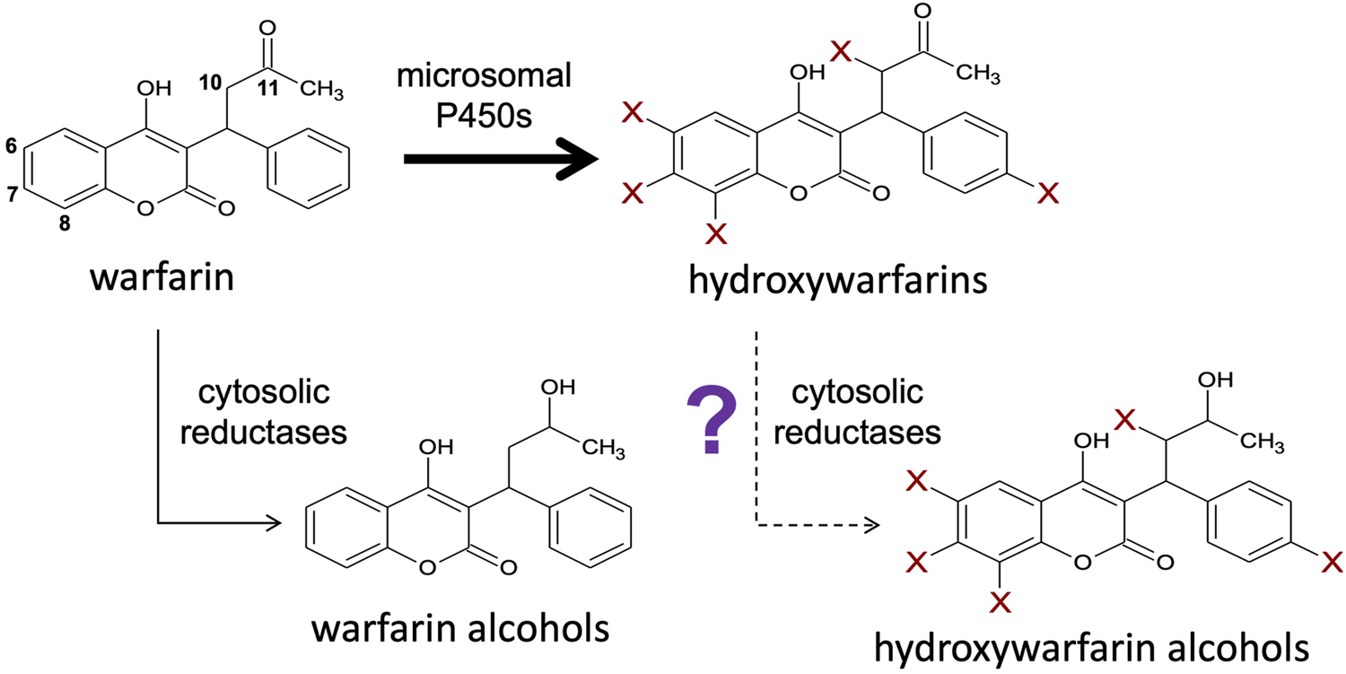 Coumadin (rac-warfarin) is a highly efficacious drug that poses challenges to adequate dosing due to a narrow therapeutic range and sometimes unpredictable responses in patients. Critical determinants of that uncertainty are gaps in our understanding about how metabolism impacts the potency and levels of pharmacologically active parent drugs and metabolites. The studies reported herein revealed a previously unknown reduction pathway for the elimination of 10-hydroxywarfarin that may play a role in the uncertainty in patient response to warfarin therapy. Knowledge of pathways leading to 10-hydroxywarfarin by CYP3A4 and elimination by reductases provides a more complete picture of the metabolic flux for this metabolite. The resulting 10-hydroxywarfarin levels would then mediate its direct and indirect effects on the anticoagulant response that would be the foundation for important follow up clinical studies based on this research.