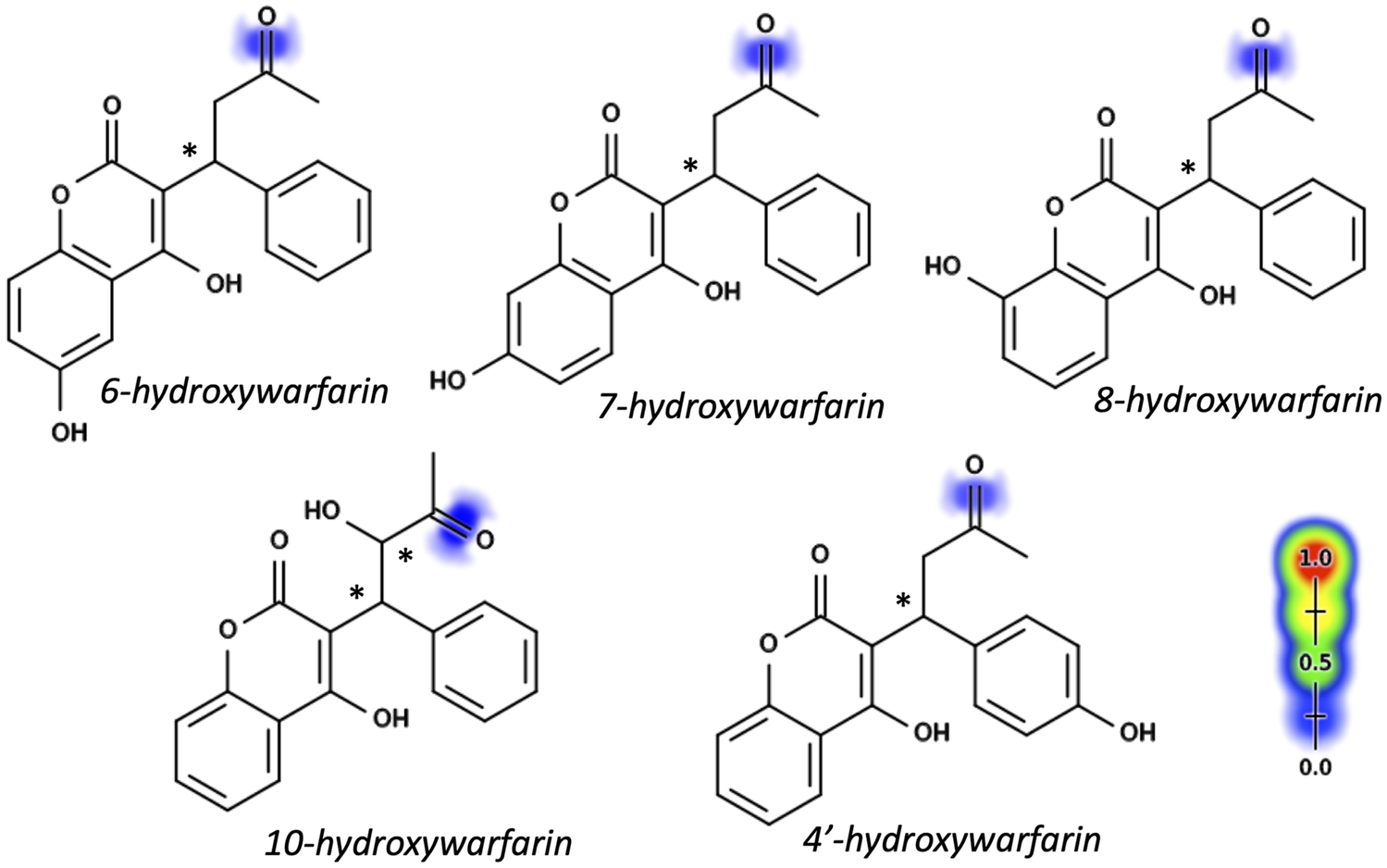 FIGURE 2. Hydroxywarfarin alcohols with reduction model predictions. Reduction predictions for hydroxywarfarins were made using the Xenosite Rainbow Model (Dang, et al., 2020). Individual bonds are scored from 0 to 1 with higher scores indicating higher likelihood of reduction and indicated pictorially with color shading from blue to red. Scores for reduction at the C11 position to form hydroxywarfarin alcohols are shown in Table 1. Asterisks denote chiral centers. All hydroxywarfarins contain a chiral center at C9 except for 10-hydroxywarfarin, which contains another at position 10.