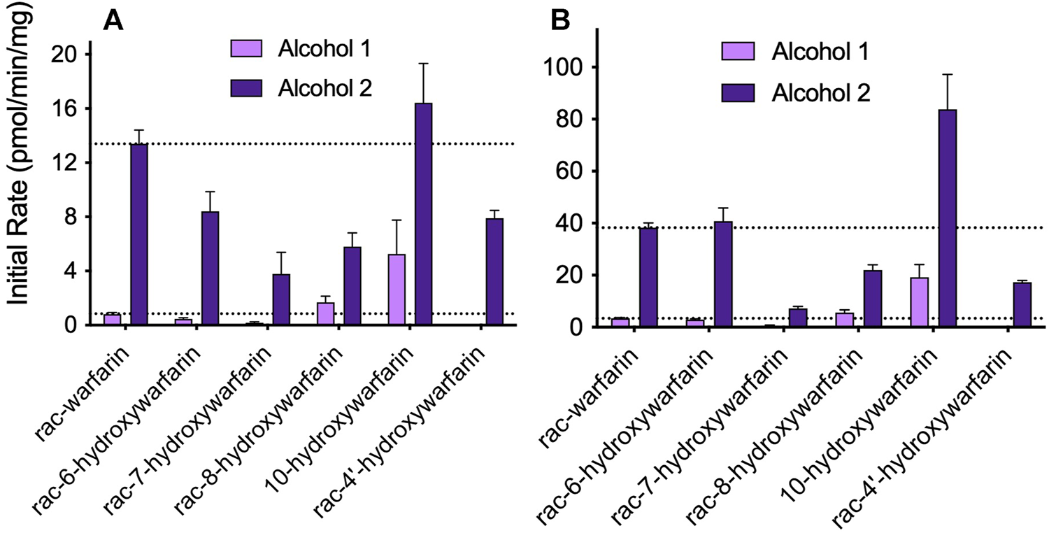 FIGURE 3. Screening hydroxywarfarins for reduction by human liver cytosol. Initial reactions were carried out with 1.0 mg/ml protein human liver cytosol in 50 mM potassium phosphate pH 7.4 with either (A) 100 or (B) 1,000 μM rac-warfarin (positive control) or rac-hydroxywarfarin. Reactions yielded alcohol 1 (minor metabolite, light purple) and alcohol 2 (major metabolite, dark purple), although the reaction for rac-4′-hydroxywarfarin generated only alcohol 2.
