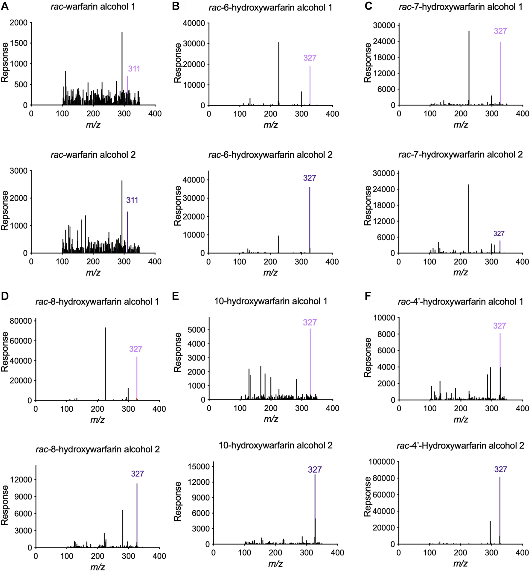 FIGURE 4. Tandem Mass Spectrometry (LC-MS/MS) analysis confirmed the predicted masses of the reduced hydroxywarfarin metabolites with reduced warfarin as a control. Parent mass scans were conducted for the metabolites from cytosolic reduction reactions for (A) rac-warfarin, (B) rac-6-hydroxywarfarin, (C) rac-7-hydroxywarfarin, (D) rac-8-hydroxywarfarin, (E) 10-hydroxywarfarin isomer mixture, and (F) rac-4′-hydroxywarfarin. Each panel includes the mass spectrum for alcohol 1 (top) and alcohol 2 (bottom). The colored line indicates the expected and observed 311 m/z for warfarin alcohol 1 (light purple) and alcohol 2 (dark purple) and the expected and observed 327 m/z for hydroxywarfarin alcohol 1 (light purple) and alcohol 2 (dark purple), respectively.