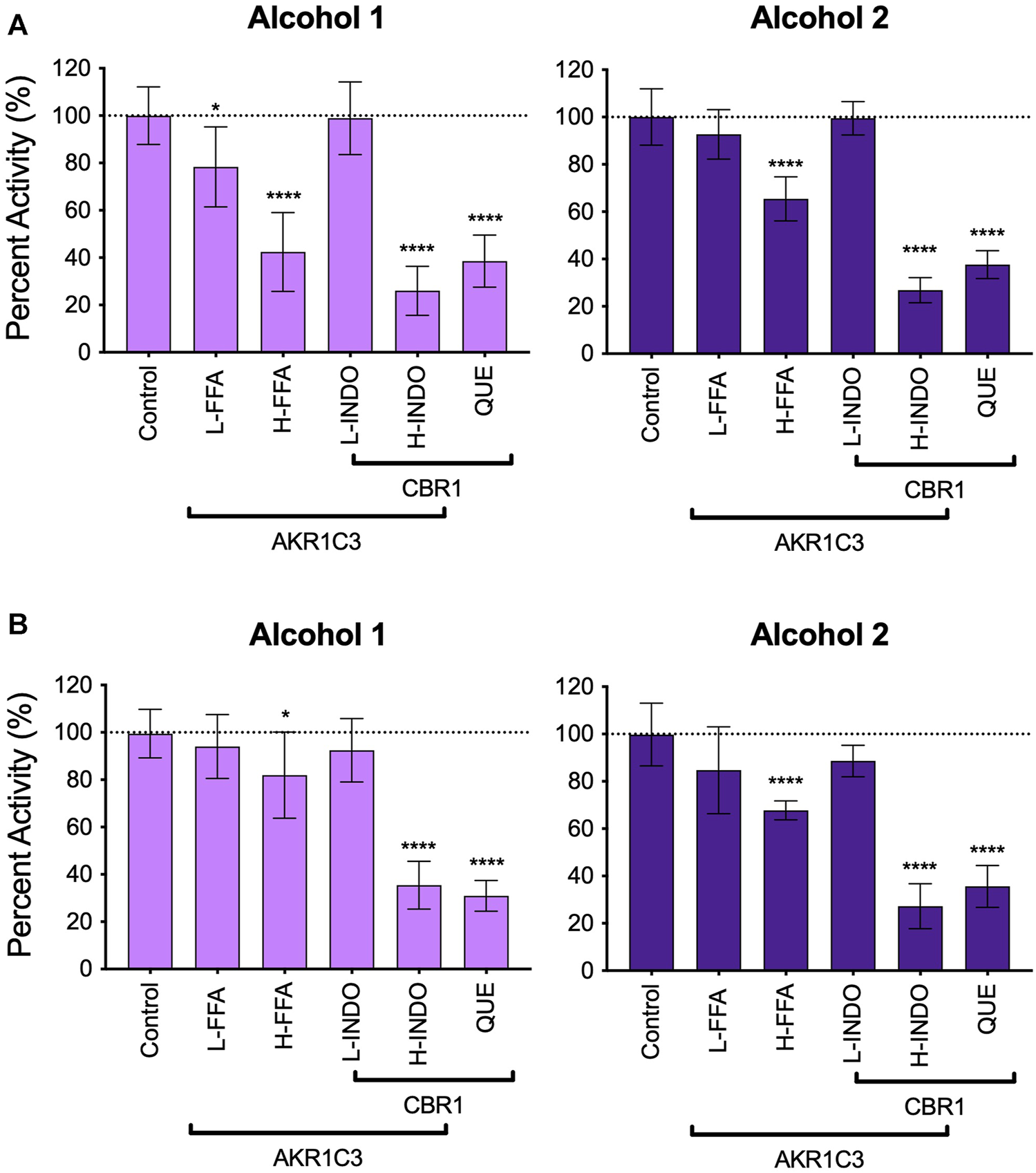 FIGURE 6. Inhibitor phenotyping for 7- and 10-hydroxywarfarin carbonyl reduction reactions in human liver cytosol. Inhibitor reactions contained 1.0 mg/ml protein human liver cytosol in 50 mM potassium phosphate pH 7.4 and 5% methanol with 250 μM substrate with and without reductase inhibitors for AKR1C3 and CBR1 for (A) rac-7-hydroxywarfarin and (B) 10-hydroxywarfarin. The specificities of the inhibitors are indicated by the bars in which some inhibitors and conditions were specific for either reductase while other conditions inhibited both reductases. Significance was determined using one way ANOVA statistical test. Abbreviations are as follows: L-FFA: low flufenamic acid (2 μM); H-FFA: high flufenamic acid (10 μM); L-INDO: low indomethacin (5 μM); H-INDO: high indomethacin (INDO, 180 μM); QUE: quercetin (60 μM).