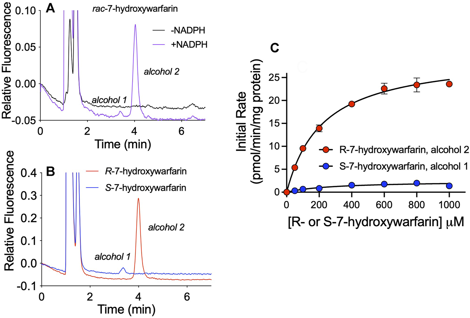 FIGURE 7. Enantioselective and enantiospecific metabolism of R- and S-7-hydroxywarfarin. An exploration of the impact of chirality on hydroxywarfarin reduction carried out with chromatographically purified 7-hydroxywarfarin enantiomers. (A) As a baseline for comparison, chromatographic analysis of 200 μM rac-7-hydroxywarfarin reduction (100 μM of each enantiomer) using 1.0 mg/ml protein human liver cytosol in 50 mM potassium phosphate pH 7.4 in the absence or presence of NADPH. (B) Chromatographic analysis of the reduction of 100 μM of either R-7-hydroxywarfarin (red) or S-7-hydroxywarfarin (blue) under the same reaction conditions. (C) Steady-state kinetics were carried out with the same reaction conditions but varying concentrations of substrate. Plots of initial rates as a function of 7-hydroxywarfarin concentration were fit to the Michaelis-Menten mechanism for R-7-hydroxywarfarin (red, alcohol 2) or S-7-hydroxywarfarin (blue, alcohol 1). The corresponding kinetic constants are reported in Reductases Showed Chiral Preferences in R- and S-7-Hydroxywarfarin Reductions under Results.