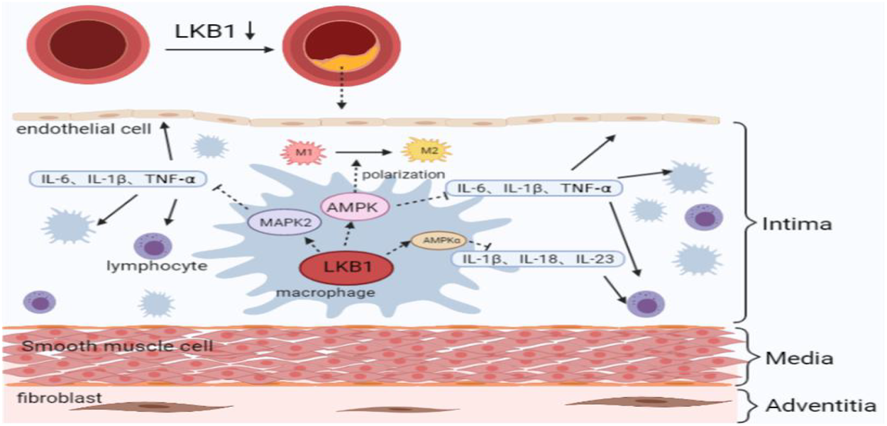 The diverse and complex roles of LKB1 in the development of atherosclerosis. LKB1 participates in multiple regulatory activities in vascular macrophages.
