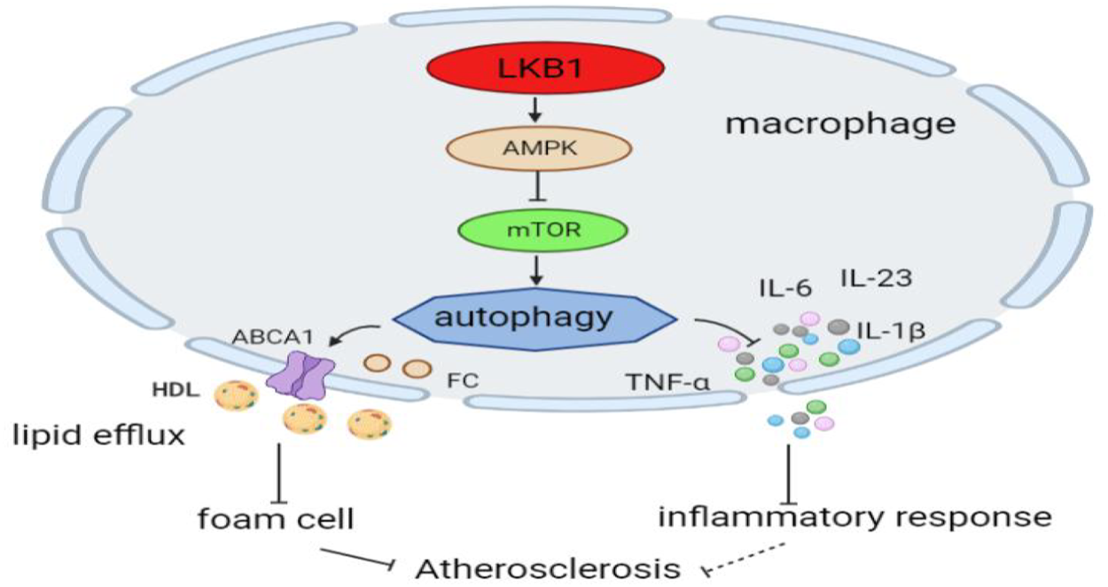 LKB1 and macrophage autophagy in atherosclerosis. Activation of the LKB1/AMPK/mTOR signaling pathway can induce autophagic activity in macrophages.