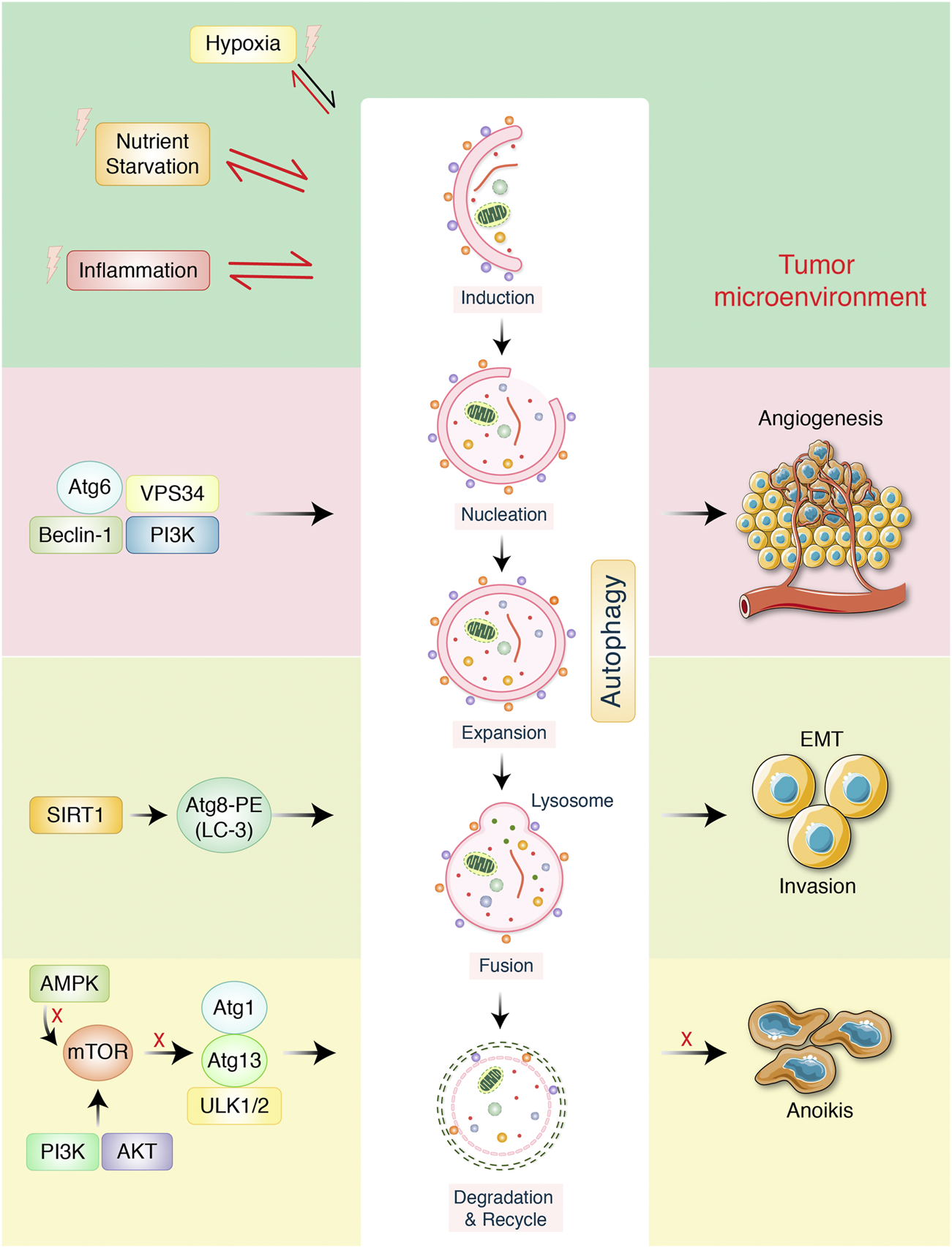 FIGURE 2. Autophagy-mediated metastasis formation in gastric cancer. The autophagy-related proteins are involved in regulation in cancer. Starvation, hypoxia, and inflammation might be stimulated during autophagic process which create tumor microenvironment. VPS34, ATG6, beclin-1, and PI3K increase tumor angiogenesis. Transcription factor SIRT1 activates autophagy improvement via inducing ATG8-LC-3-PE conjugation, which later encourages epithelial-to-mesenchymal transition (EMT), as well as tumor invasion. mTOR negatively regulates autophagy via inhibiting ATG13-ATG1-ULK1/2 protein complex. AMPK/PI3K regulates autophagy, which detached tumor cells to overcome anoikis.