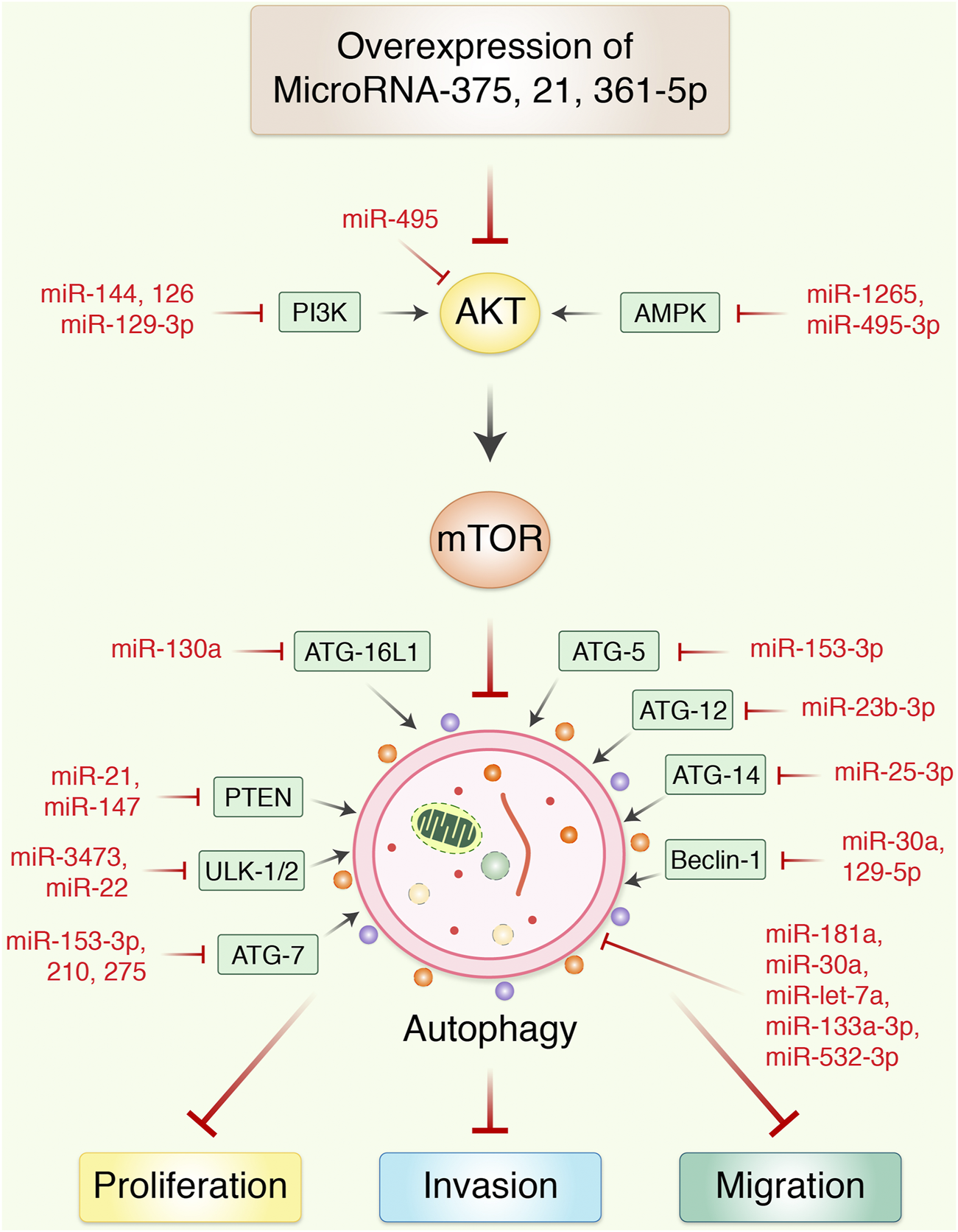 FIGURE 3. MicroRNAs regulates autophagy-mediated cell proliferation and migration in gastric cancer. Overexpression of miR-375 inhibited the proliferation and migration of gastric cancer in vitro and xenograft nude mouse model. miRNA blocks autophagy via AKT/mTOR signaling pathway and regulating invasion as well as migration in epithelial-to-mesenchymal transition. In addition, most usually effective miRNAs control the transcriptional expression of upstream activators and inhibitors of autophagy in gastric cancer.