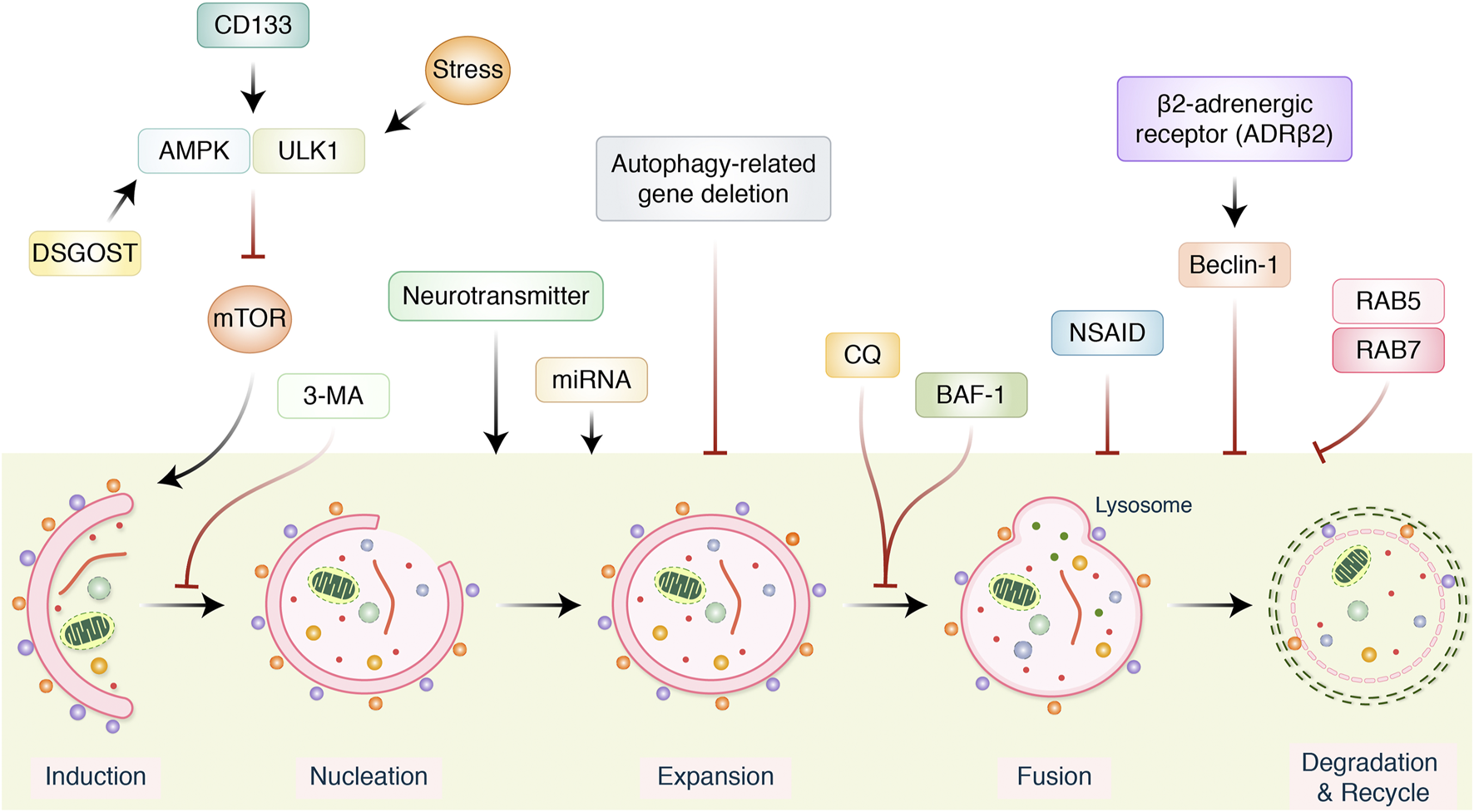 FIGURE 4. Several signaling pathways modulating autophagy in gastric cancer treatment. AMPK/ULK1 inhibits mTOR pathway, which positively activates autophagy induction. Neurotransmitter and miRNA regulate autophagy induction. However, autophagy-related gene (ATG), 3-metheylalanine (3-MA), chloroquine (CQ), bafilomycin A1 (BAF-1), and nonsteroidal anti-inflammatory drugs (NSAIDs) inhibited and modulated entire autophagy process. β2-Adrenergic receptor activates beclin-1 and inhibits autophagy.