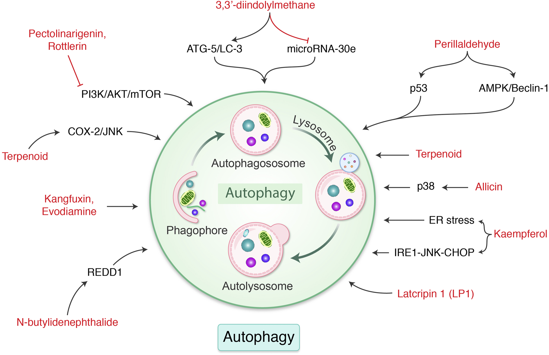 Phytochemicals have been demonstrated to be promising for regulating and controlling GC (Mitra and Dash 2018), which makes it possible for cellular components to degrade and be recycled in a controlled manner (Yao et al., 2021). Numerous phytochemicals and their autophagic activities are summarized in Table 2. Rottlerin, extracted from Mallotus philippensis Muell (Euphorbiaceae), induced autophagy and caspase-independent apoptosis against SGC-7901 and MGC-803 cells (Song et al., 2018). Evodiamine activates autophagy through beclin-2 expression in SGC-7901 GC cells (Rasul et al., 2012). Morus alba root extract, containing oxyresveratrol, has been found to accumulate ROS production and initiate autophagic and apoptotic cell death via FOXO-caspase-3 pathway (Kwon et al., 2015; Rahman et al., 2017). Cytotoxic activity on AGS, MKN-45, and KATO-III human GC cells via induction of caspase activation and autophagy via AKT/NF-κB pathway in AGS cells (Kang et al., 2021) have been demonstrated. 3,3′-Diindolylmethane modulates autophagy activation by miR-30e-ATG-5 in BGC-823 and SGC-7901 cells (Ye et al., 2016). Pectolinarigenin, a natural flavonoid present in Cirsium chanroenicum, downregulated PI3K/AKT/mTOR pathway via G2/M phase cell cycle arrest, apoptotic, and autophagic cell death in human GC cells (Lee et al., 2018). Flux analysis of autophagy and increase in the level of LC-3-II revealed induction of autophagy by the tuber of Amorphophallus konjac. G0/G1 phase cell cycle arrest has been detected by flow cytometry. Chen et al. determined apoptosis- and autophagy-inducing effects of kangfuxin, an organic extract of Periplaneta americana Linnaeus. (Blattidae), against SGC-7901 cell line (Chen et al., 2017). Proteins that mediate ER stress–mediated apoptosis including glucose-regulated protein 78 (GRP78), C/EBP-homologous protein (CHOP), and caspase-12 have been greatly upregulated in the group treated with kangfuxin. In addition, the LC-3-I/LC-3-II ratio and expression levels of beclin-1 were also higher in the kangfuxin group. Also, 3,3′-diindolylmethane, derived from cruciferous vegetables, increased the ATG-5 expression and LC-3 in GC cells in addition to decrease miRNAs-30e level (Ye et al., 2016). Besides, perillaldehyde, isolated from Perilla frutescens, increased AMPK phosphorylation, leading to autophagy via beclin-1, LC-3-II, cathepsin, p53, and caspase-3 in tumor xenograft model of GC in MFC mouse as well as GC9811-P human GC cells (Zhang et al., 2018b). Danggui-Sayuk-Ga-Osuyu-Saenggang-Tang (DSGOST), a traditional Chinese medicine, stimulates autophagy by triggering AMPK/ULK1 signaling, consequently activating EMT and exosomes to increase chemoresistance, and therefore, one of the mechanisms of GC resistance to DSGOST is survival, promoting autophagy. Using compound C, a well-known suppressor of AMPK, to impede DSGOST-mediated autophagy and diminish drug resistance, promotes killing of GC cells and decreases their drug tolerance (Kim et al., 2018a). In addition, natural plant components of Saussurea lappa Clarke, Dioscorea nipponica Makino, and Melandrium firmum have been found to induce antiproliferative and apoptotic functions (Rahman et al., 2013; Rahman et al., 2014; Rahman et al., 2015). Latcripin 1 (LP1) was found to arrest S-phase cell cycle as well as decrease matrix metalloproteinase 2 (MMP-2) and MMP-9 expression with induction formation of autophagosomes by AKT/mTOR pathway against GC cell lines SGC-7901 and BGC-823 (Batool et al., 2018). Allicin has been found to increase autophagy in human GC cell MGC-803, BGC-823, and SGC-7901 cells via regulation of p38 signaling (Zhang et al., 2015). Kaempferol, a flavonoid isolated from fruits and vegetables, induces autophagic cell death through IRE1-JNK-CHOP activation in response to ER stress in human GC cell lines (Kim et al., 2018b). Numerous phytochemicals and their response in GC by autophagy signaling are presented in Figure 5. Therefore, autophagy induction by phytochemical might possibly be targeted as a potential therapeutic approach to control GC.