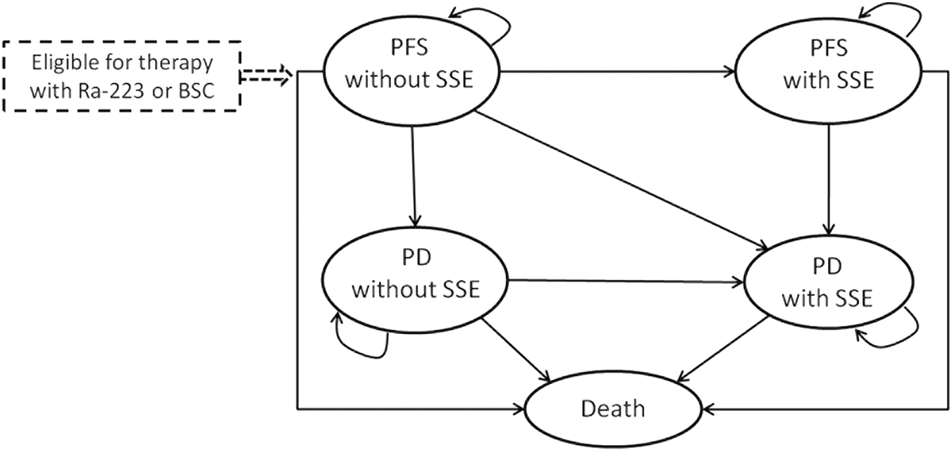 Markov model for patients with metastatic castration-resistant prostate cancer. PFS: progression-free survival; SSE: symptomatic skeletal event; Ra-223: radium-223; PD: progression survival; BSC: best standard care.