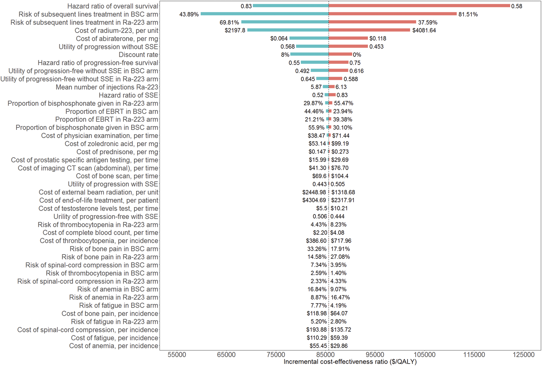 Patients treated with Ra-223 achieved QALYs of 1.047, which was 0.344 more than those receiving BSC treatment. The total cost per patient in the Ra-223 and BSC arms was 54,963 USD and 25,504 USD, respectively. The ICUR for the Ra-223 arm versus the BSC arm was $85,647 per QALY (Table 3).