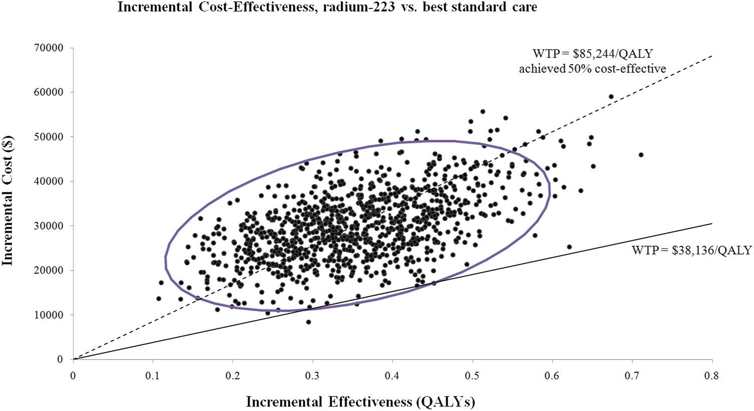 Results: Compared with the BSC arm, radium-223 achieved an excess 0.344 QALYs with an incremental cost of $29,459, resulting in an ICUR of $85,647 per QALY. The probability of Ra-223 being cost effective for the patients with bone mCRPC was sharply low (<0.5%) at a willingness-to-pay threshold of $38,136/QALY. Uncertainty analyses revealed that the model is robust to all the input parameters.