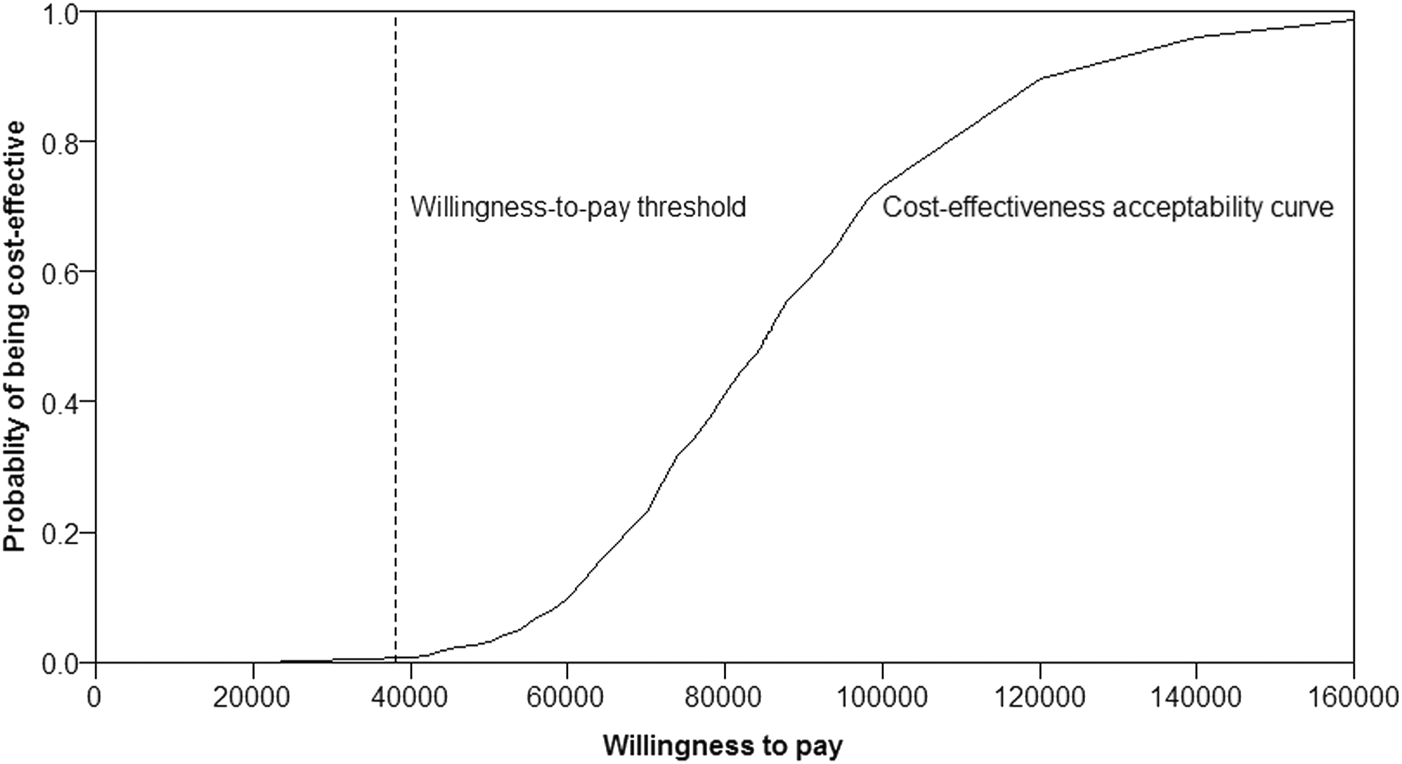 Almost the majority of the dots in the incremental cost-effectiveness scatterplot of 1,000 iterations were above the WTP threshold of $38,136/QALY (Figure 3). If the WTP threshold was more than $85,824/QALY, more than 50% of dots were cost-effective (below the WTP threshold). The probability of Ra-223 being cost-effective for the patients with bone mCRPC was sharply low (<0.5%) at the current WTP threshold ($38,136/QALY), according to the cost-effectiveness acceptability curve (Figure 4).
