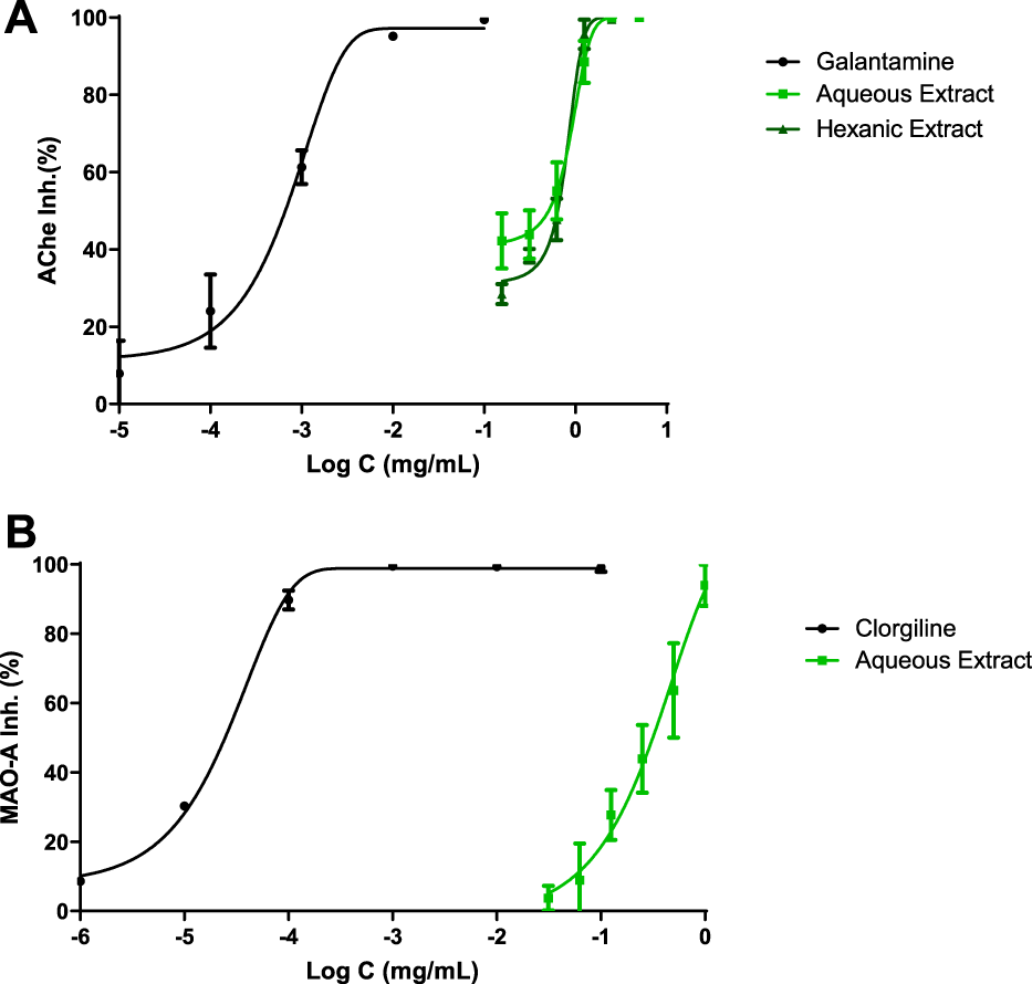 MAO-A inhibition was analyzed in Figure 1B; clorgiline, which was the reference drug, exhibited 0.02 μg ml−1 as IC50 value. On the other hand, AE displayed a value of 315 μg ml−1 and achieved the total inhibition of the enzyme.
