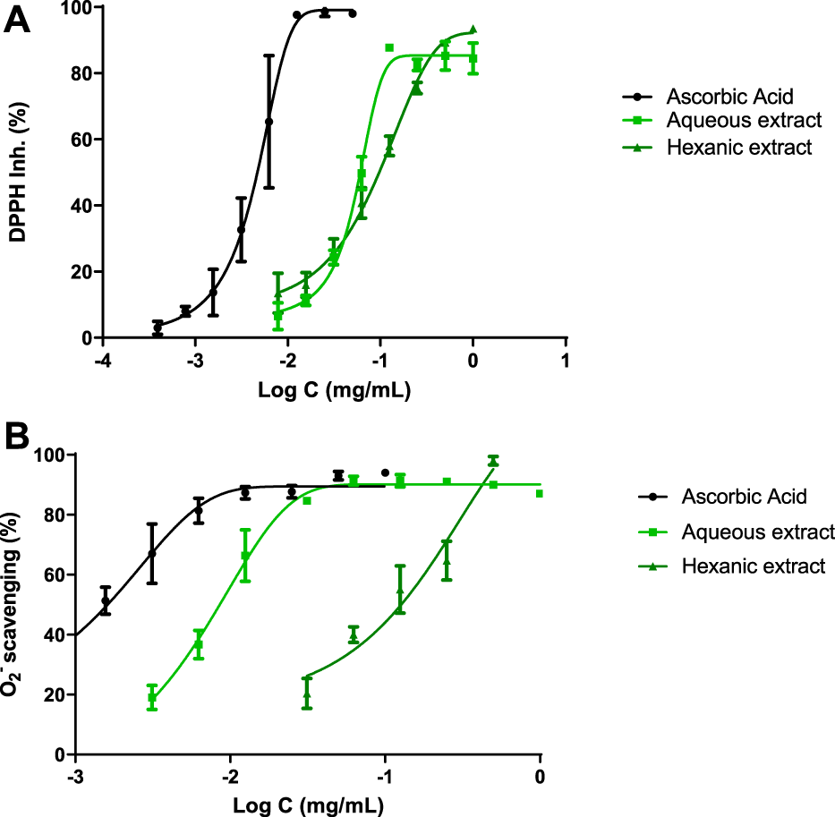 Figure 2A shows the DPPH scavenging capacity of both hemp extracts and ascorbic acid as reference compound. A non-linear regression was displayed and IC50 values were achieved for each compound. These values were 5 μg ml−1 for ascorbic acid, 60 μg ml−1 for AE and 97 μg ml−1 for HE. In order to improve antioxidant background, superoxide radical scavenger activity was reached by xanthine/xanthine oxidase system (Figure 2B), where IC50 values were 1 μg ml−1, 9 μg ml−1 and 127 μg ml−1 for ascorbic acid, AE and HE, respectively.