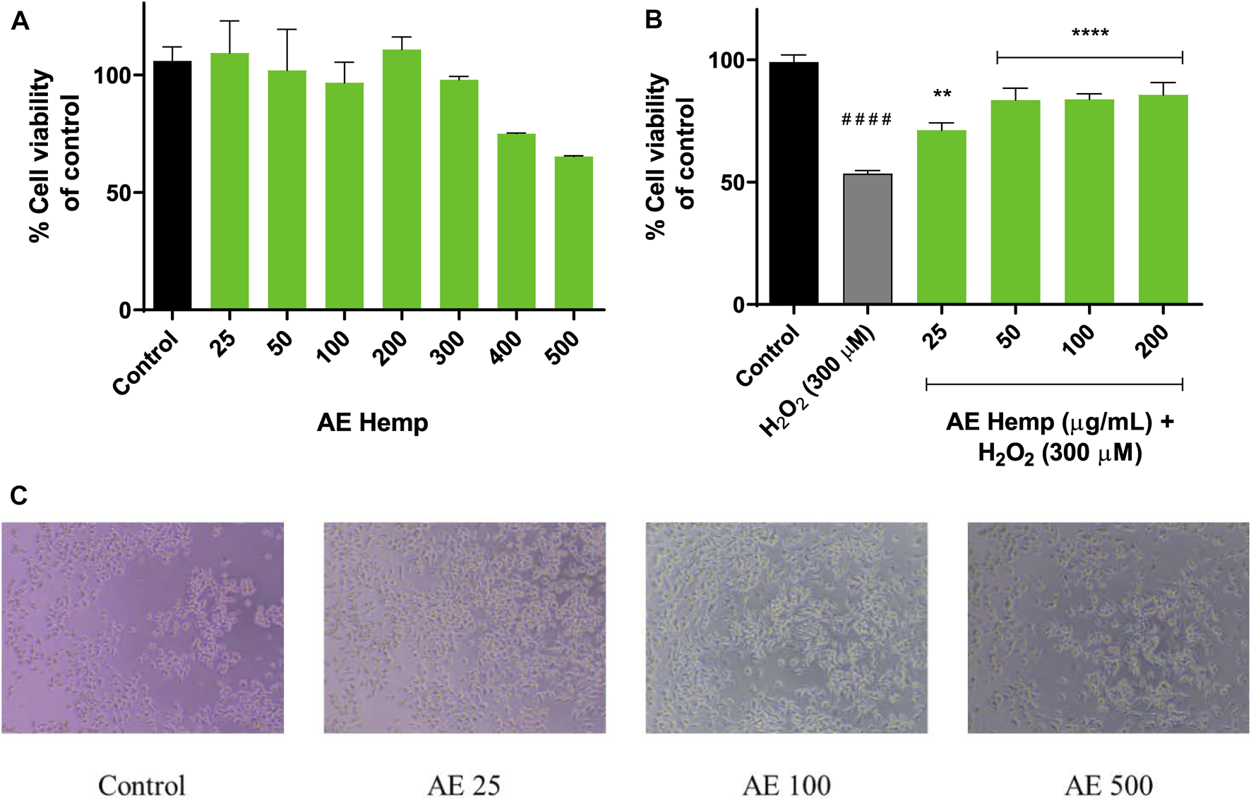 FIGURE 3. Mitochondrial response. (A) Cytotoxicity of Neuro-2a cells after exposure to different concentrations of Cannabis sativa aqueous extract. (B) Cytoprotective effects of Cannabis sativa aqueous extract versus hydrogen peroxide (300 µM). (C) Inverted microscope images of Neuro-2a cells (0–500 μg/ml) Note: **p < 0.01 versus H2O2; ****p < 0.001 versus H2O2; ####p < 0.001 versus control.
