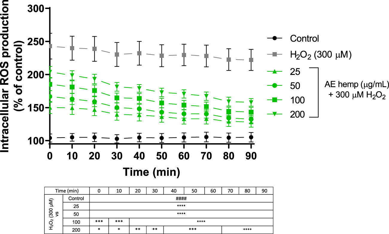 ROS detection confirmed the antioxidant potential of AE (Figure 4). In this 90 min assay, Neuro-2a cells were simultaneously exposed to different AE concentrations and hydrogen peroxide. Since T = 0, these dilutions countered the effect of the free radicals generated by the prooxidant. These reactive oxygen species produced by hydrogen peroxide treated cells maintained around 220–270% over control cells while cotreated cells (hemp + H2O2) reduced this production below 200%. Even more, last measurements continued to reduce ROS production almost reaching values of control cells.