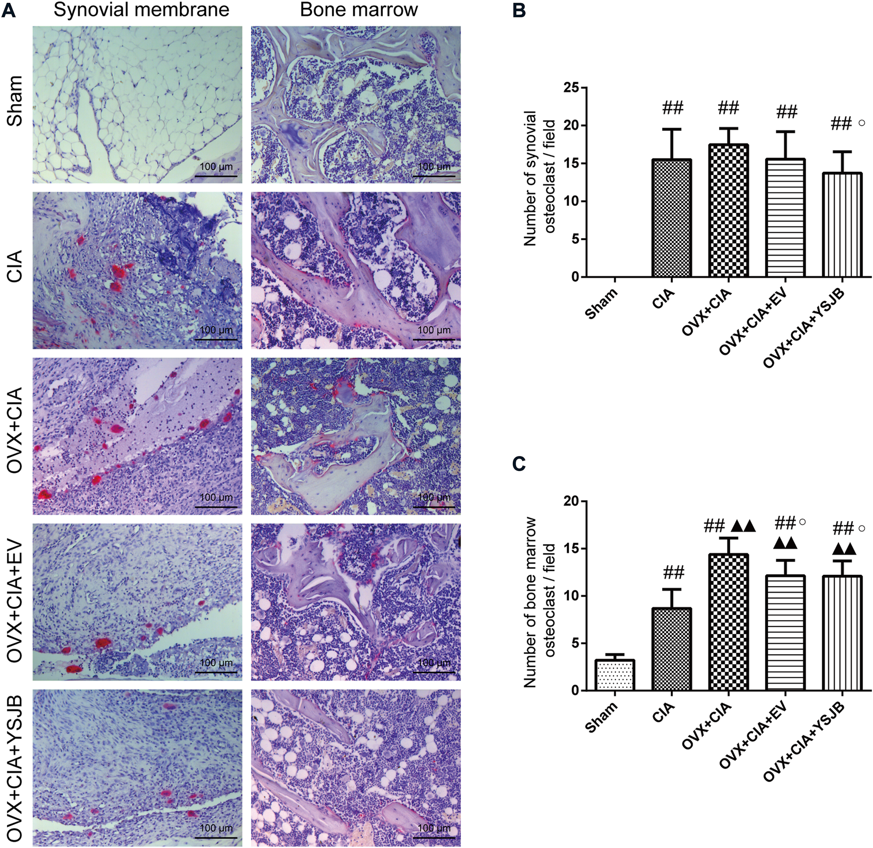 YSJB suppresses osteoclast differentiation in the synovial membrane and bone marrow of OVX + CIA rats. (A) Sections of ankle joints were stained with TRACP. (B,C) Evaluation of osteoclasts in the synovial membrane and bone marrow. Data are the mean ± SD.#p < 0.05, ##p < 0.01 compared with the sham group. ▲p < 0.05, ▲▲p < 0.01 compared with the CIA group. ○p < 0.05 compared with the OVX + CIA group.