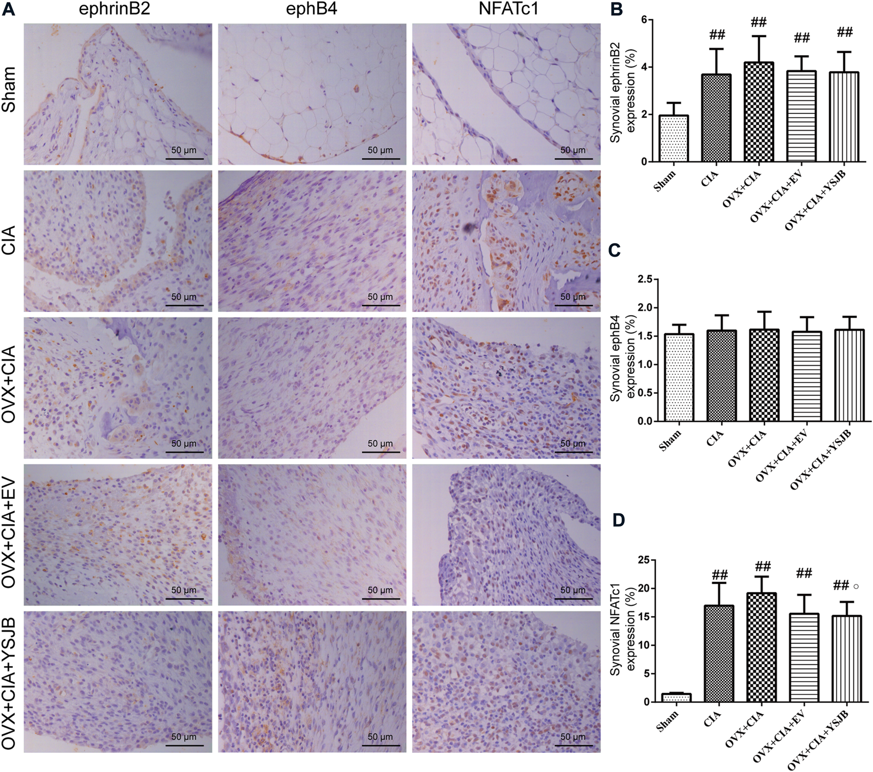 Effects of YSJB on regulation of the ephrinB2/ephB4/NFATc1 signaling pathway in the synovial membrane. Protein expression in paw sections was measured by immunohistochemistry. (A) Immunohistochemical staining showing protein expression of ephrinB2, ephB4, and NFATc1. (B–D) Bar plots represent mean protein expression of ephrinB2, ephB4, and NFATc1. Data are the mean ± SD.##p < 0.01 compared with the sham group. ○p < 0.05 compared with the OVX + CIA group.