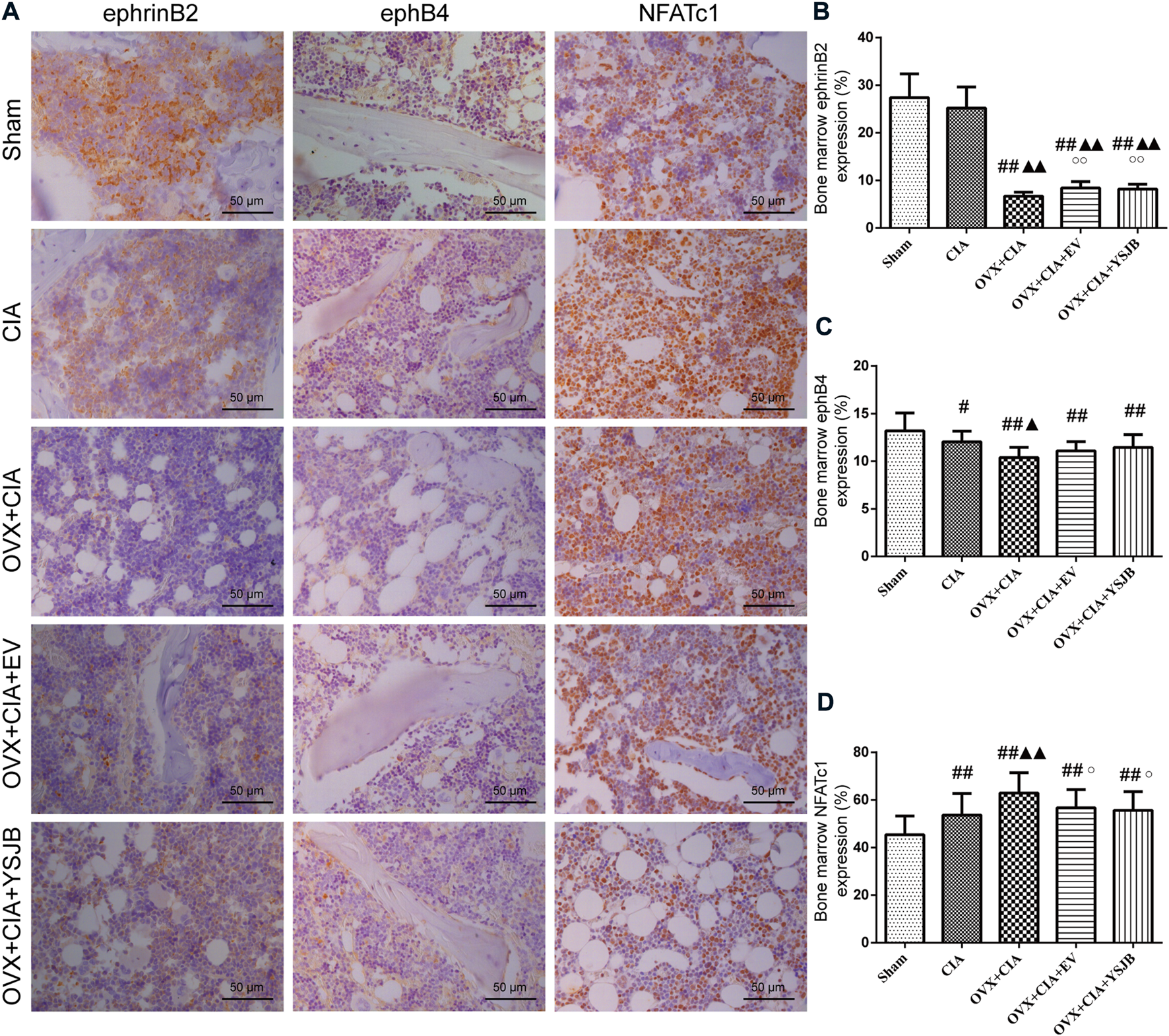 YSJB modulates the ephrinB2/ephB4/NFATc1 signaling pathway in the bone marrow to prevent bone destruction in OVX + CIA rats. (A) Immunohistochemical staining showing protein expression of ephrinB2, ephB4, and NFATc1 in the bone marrow. (B–D) Bar plots represent mean protein expression of ephrinB2, ephB4, and NFATc1. Data are the mean ± SD.#p < 0.05, ##p < 0.01 compared with the sham group. ▲p < 0.05, ▲▲p < 0.01 compared with the CIA group. ○p < 0.05 compared with the OVX + CIA group.