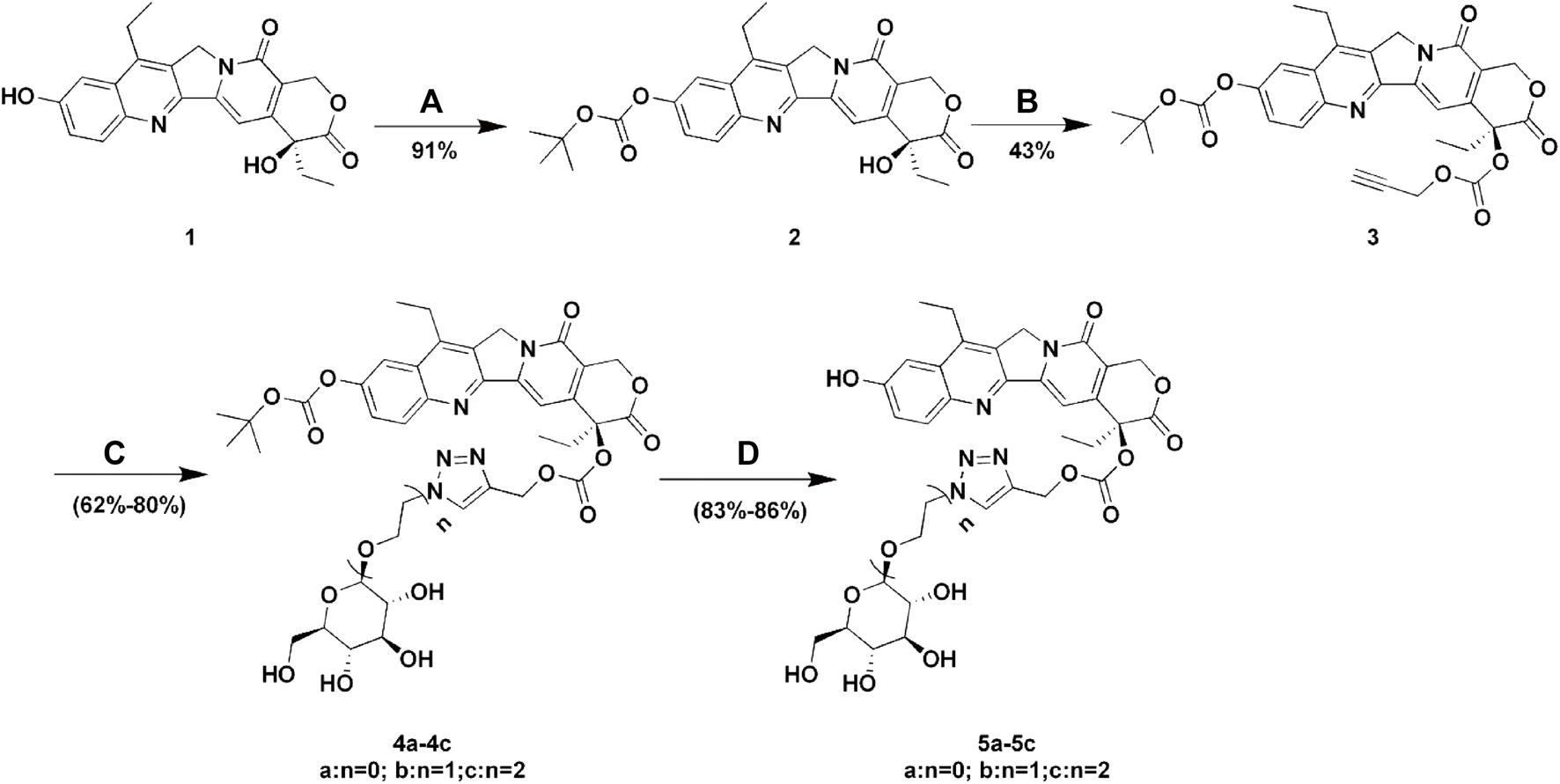 Synthesis of Glu-SN38. Reagents and conditions: (A) (BOC)2O, pyridine, DCM, 12 h; (B) propargyl alcohol, triphosgene, DMAP, DCM, 2 h; (C) glucose azides (β-D-Glucopyranosyl azide, 2-azidoethyl β-D-glucopyranoside or 2-(2-azidoethoxy) ethyl β-D-glucopyranoside), CuSO4.5H2O, sodium ascorbate, THF/H2O, 12 h; (D) TFA, DCM, 2 h.