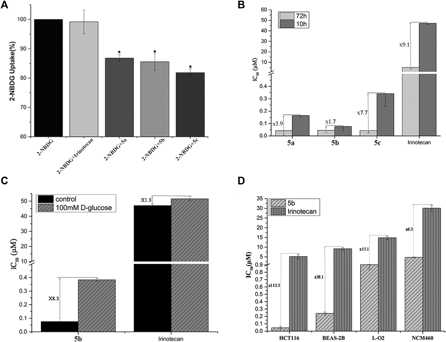 (A) Uptake of Glu-SN38 via glucose transporters using fluorescent probe 2-NBDG as competitor in HCT116 cells. (B) Effect of incubation time on IC50 values. (C) Effect of D-glucose on IC50 values. (D) Changes in IC50 values of 5b and irinotecan in cancer and normal cells.