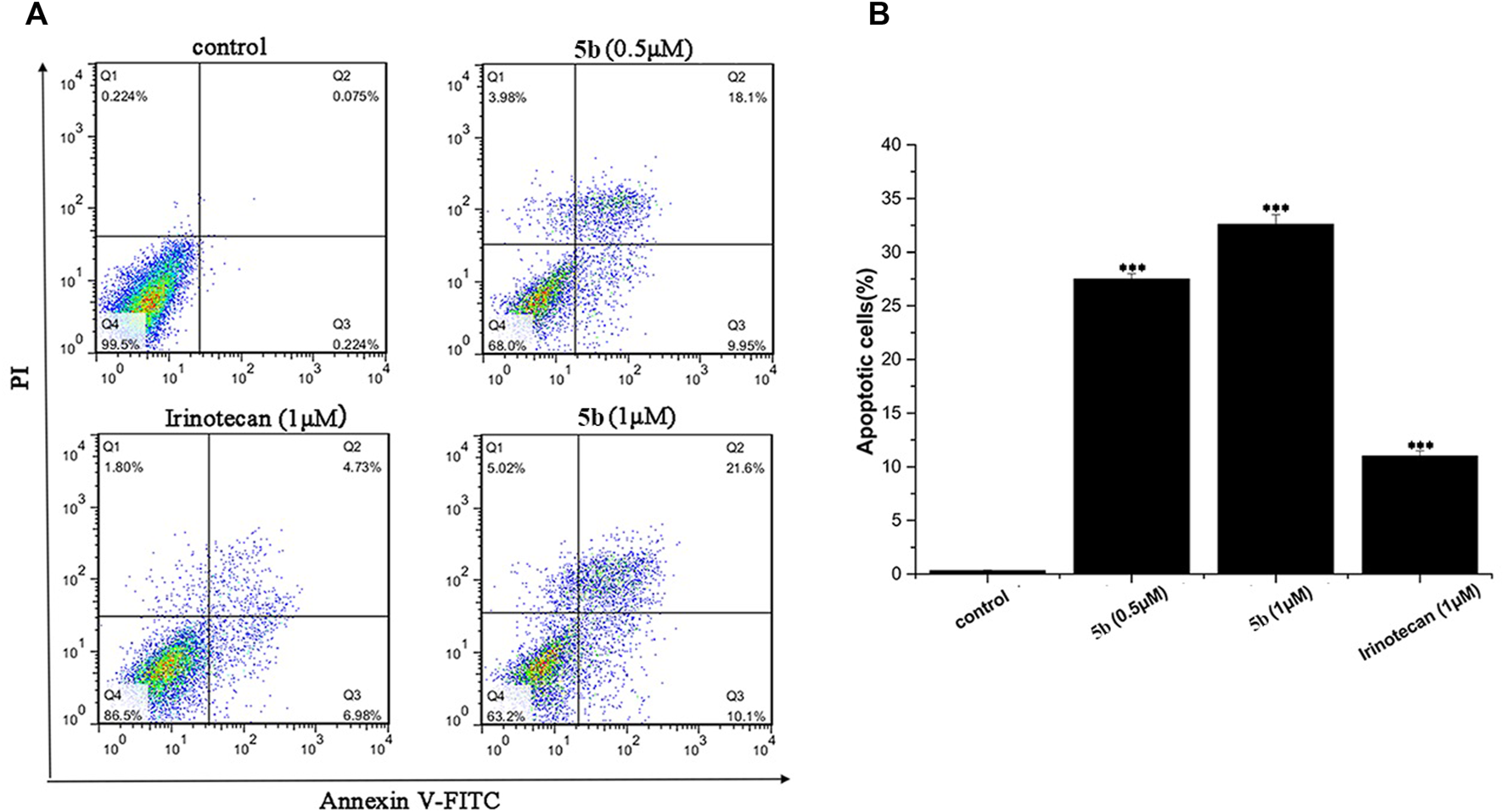 5b induced HCT116 cells apoptosis (A)The apoptosis rate of HCT116 cells treated by 5b and irinotecan. (B) Statistic results of apoptosis assays. Data are expressed as mean ± S.D. from three independent experiments (***p < 0.001).