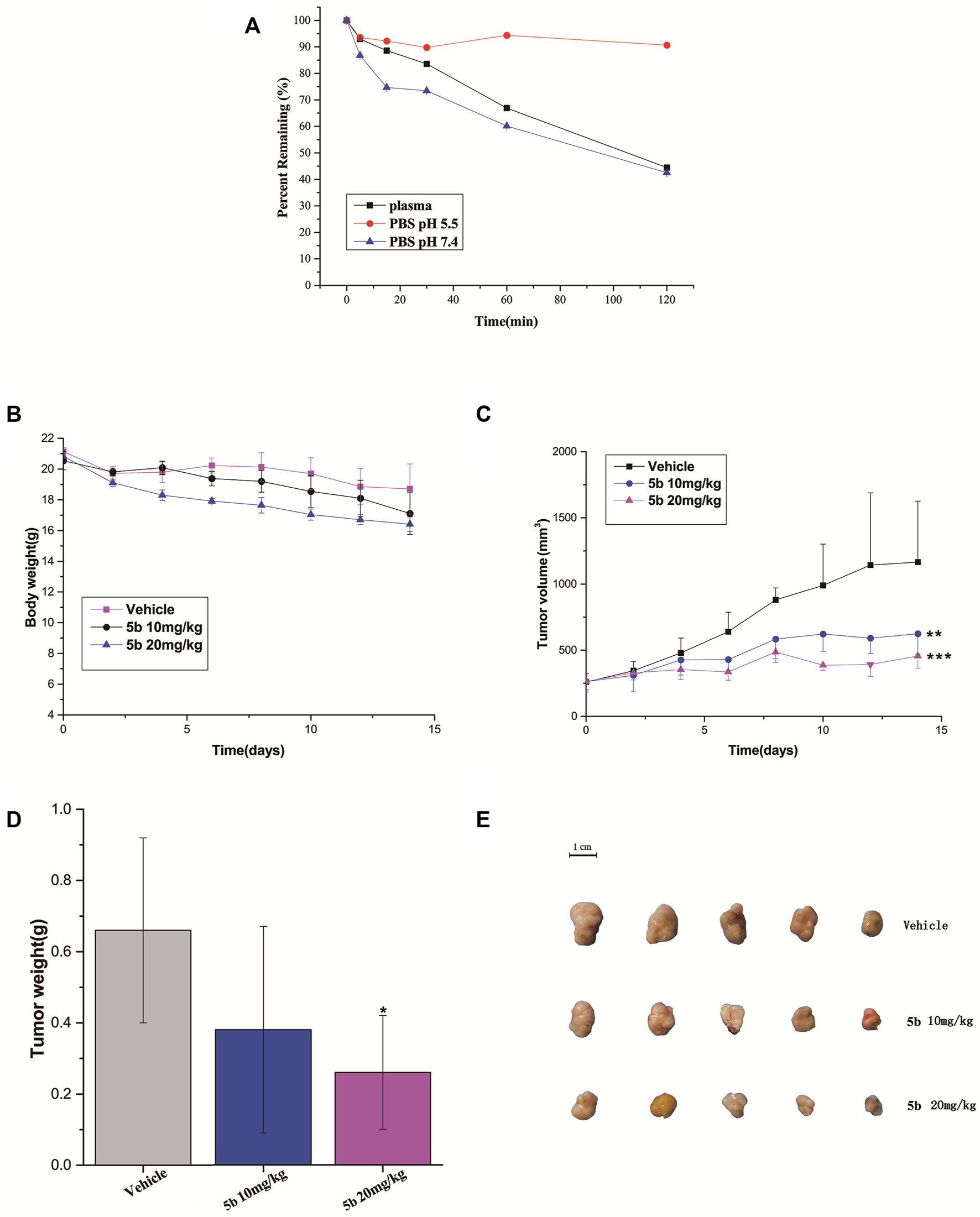 (A) Stability of compound 5b in PBS (pH 5.5 and pH 7.4) and plasma. (B) The body weight of the mice during the treatment. (C) Tumor growth of HCT116 model inhibited by 5b (**p < 0.01; ***p < 0.001). (D) Represented weight of tumors from mice of different groups, respectively. Data were mean ± S.D. (n = 5, *p < 0.05). (E) Representative photographs of subcutaneous tumors in the HCT116 model.