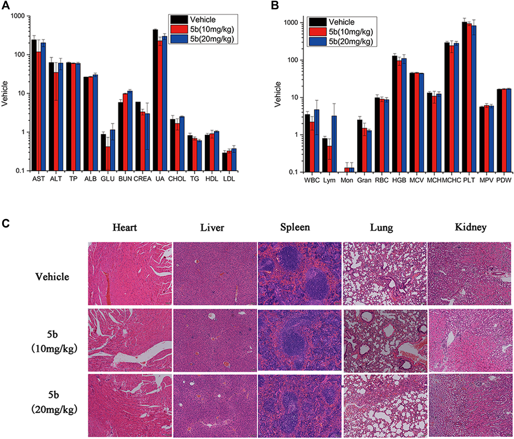 Evaluation of side effects of 5b in mice. (A) Blood chemistry analysis. (B) Blood routine analysis. (C) HE staining of the sections of the liver, kidney, spleen, lung, and heart from the mice in four groups after treatment.