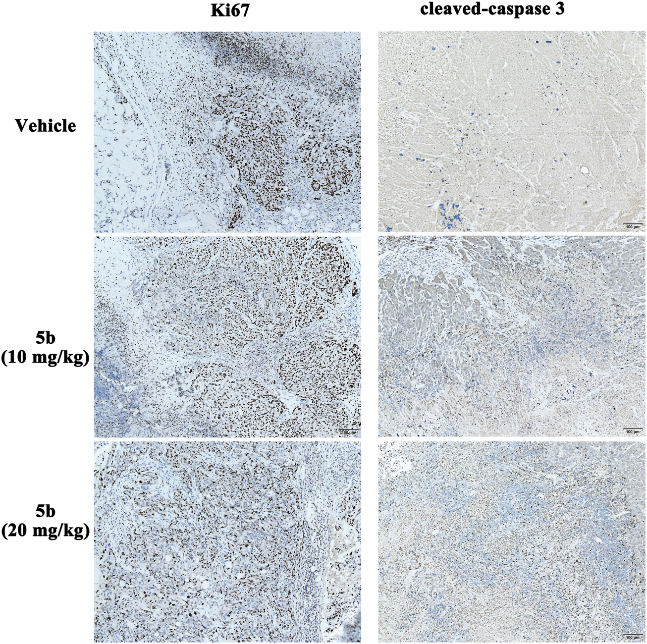 In the in vitro study, we found that 5b could inhibit cell proliferation and induce apoptosis in HCT116 cells. Ki-67 and cleaved caspase-3 (CC3) are excellent markers of proliferating and apoptotic cells, respectively (Ogane et al., 2018). To detect the effect of 5b on Ki-67 and CC3 in the tumor tissues, immunohistochemical analysis was performed using anti-Ki-67 and anti-CC3 monoclonal antibodies. As can be seen from Figure 6, the expression of Ki-67 in the 5b treated groups was significantly lower than that in the vehicle group. Moreover, compared with the vehicle group, CC-3-positive cells were apparently increased in the 5b treated groups.