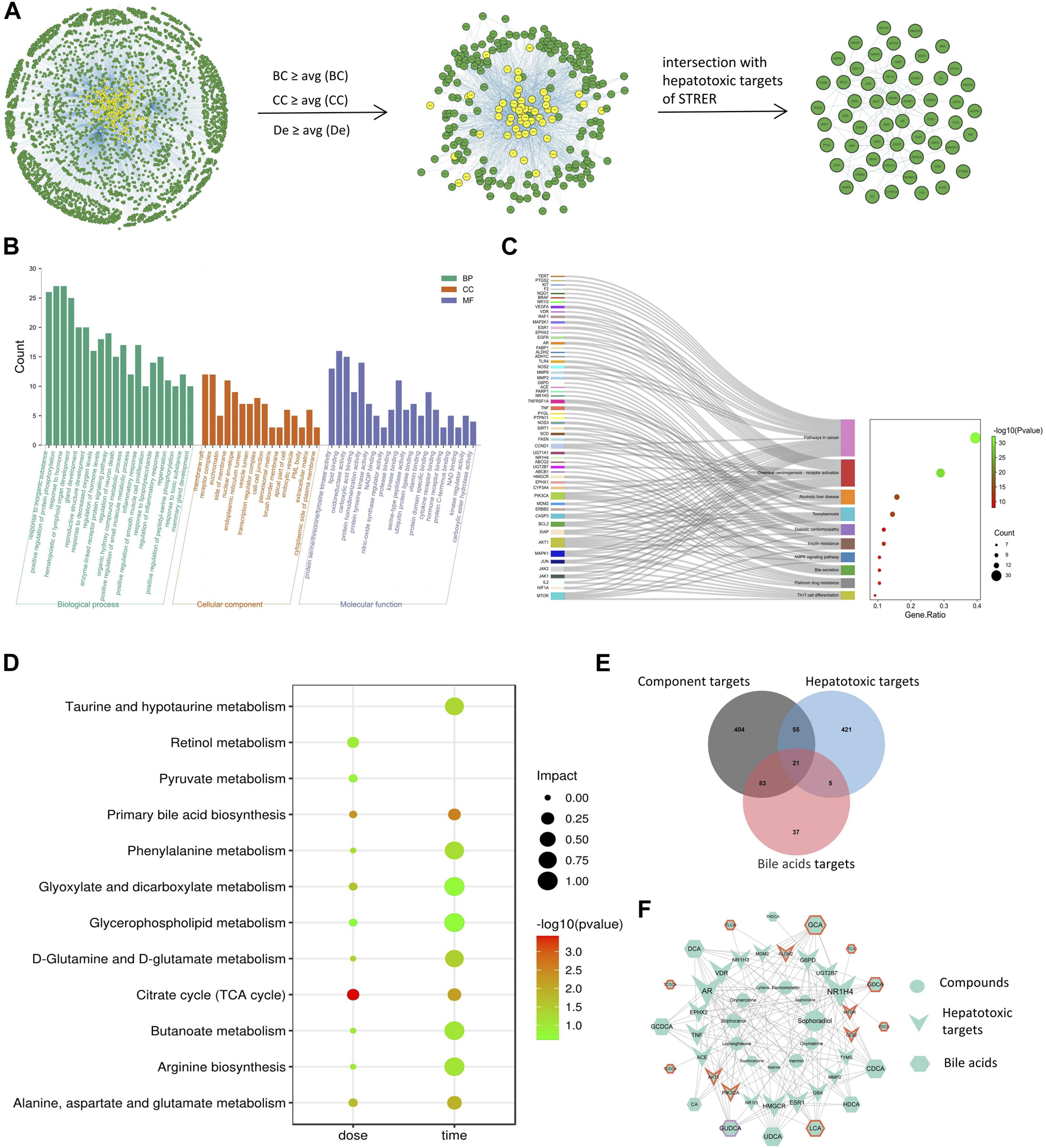 Net analysis of STRER hepatotoxic substance basis, target and metabolites based on SysT. (A) PPI network of STRER hepatotoxic targets and hub nodes screened by network parameters. (B) GO analysis in three terms including biological process (BP), cellular component (CC), and molecular function (MF). (C) KEGG analysis of STRER hepatotoxic targets. (D) KEGG pathway enrichment analysis of differential metabolites from non-targeted metabolomics. (E) Venn diagram of intersection genes among STRER hepatoxic components and bile acid targets. (F) The “compounds-hepatotoxic targets-bile acids” network. The red and purple border respectively represents time-related and dose-related targets and bile acids, while the others are common to both.