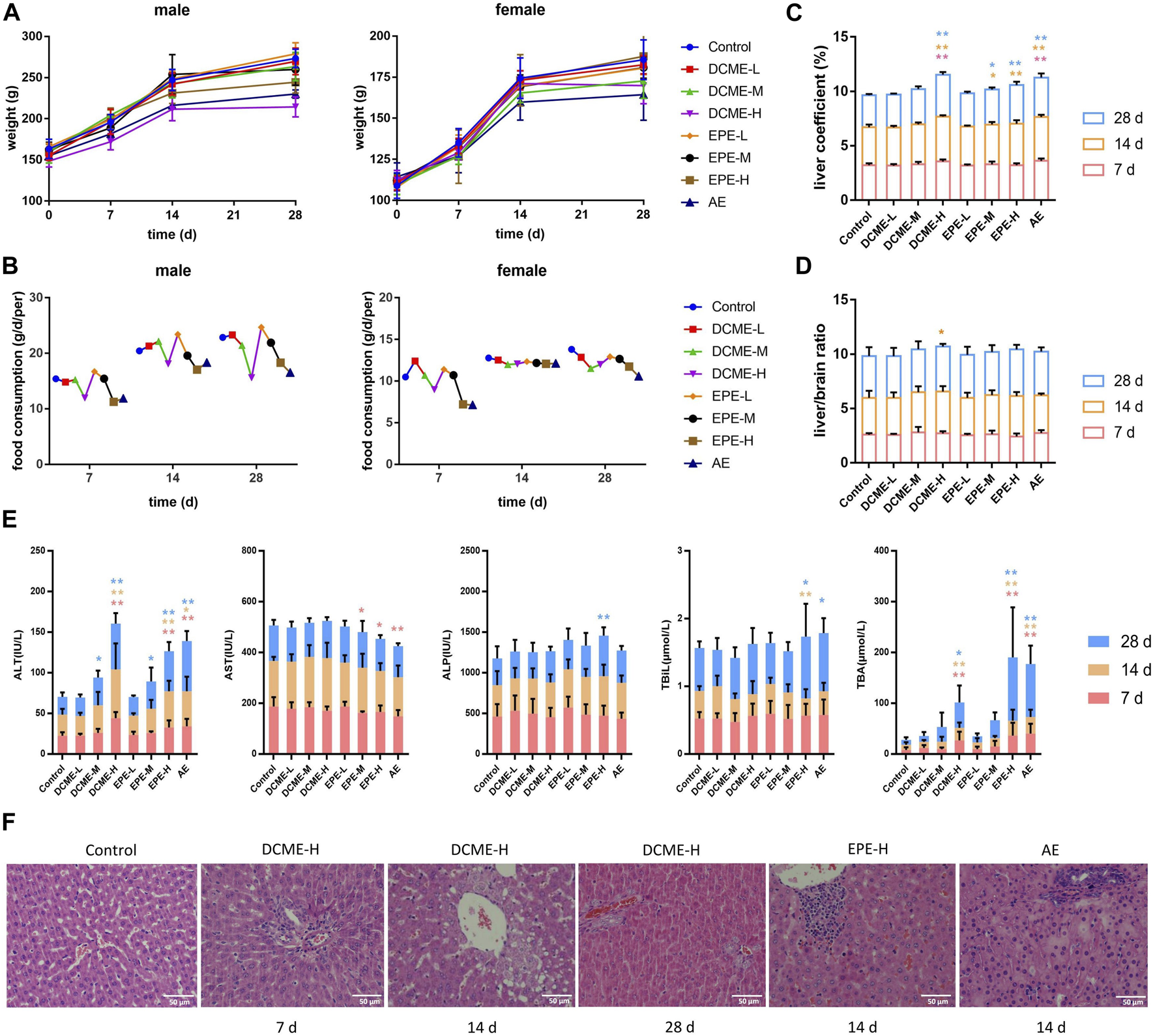 Hepatotoxic effects of different STRER extracts on rats by repeated gavage for 28 days. (A) Body weight, (B) food consumption, (C) liver coefficient and (D) liver/brain ratio of rats with administration during 28 days. (E) The contents of ALT, AST, ALP, TBIL and TBA in rat serums of different days. All data were presented as mean ± SD and compared with Control group. *p < 0.05; **p < 0.01. (F) Pathological changes of liver (HE×400). Slight biliary hyperplasia, hepatic cell micro-vacuolation and mast cell infiltration were separately found in DCME-H group of day 7 and day 14. Proliferation of bile ducts was observed from DCME-H group on day 28. Inflammatory cell infiltration was appeared in EPE-H group and AE group on day 14.