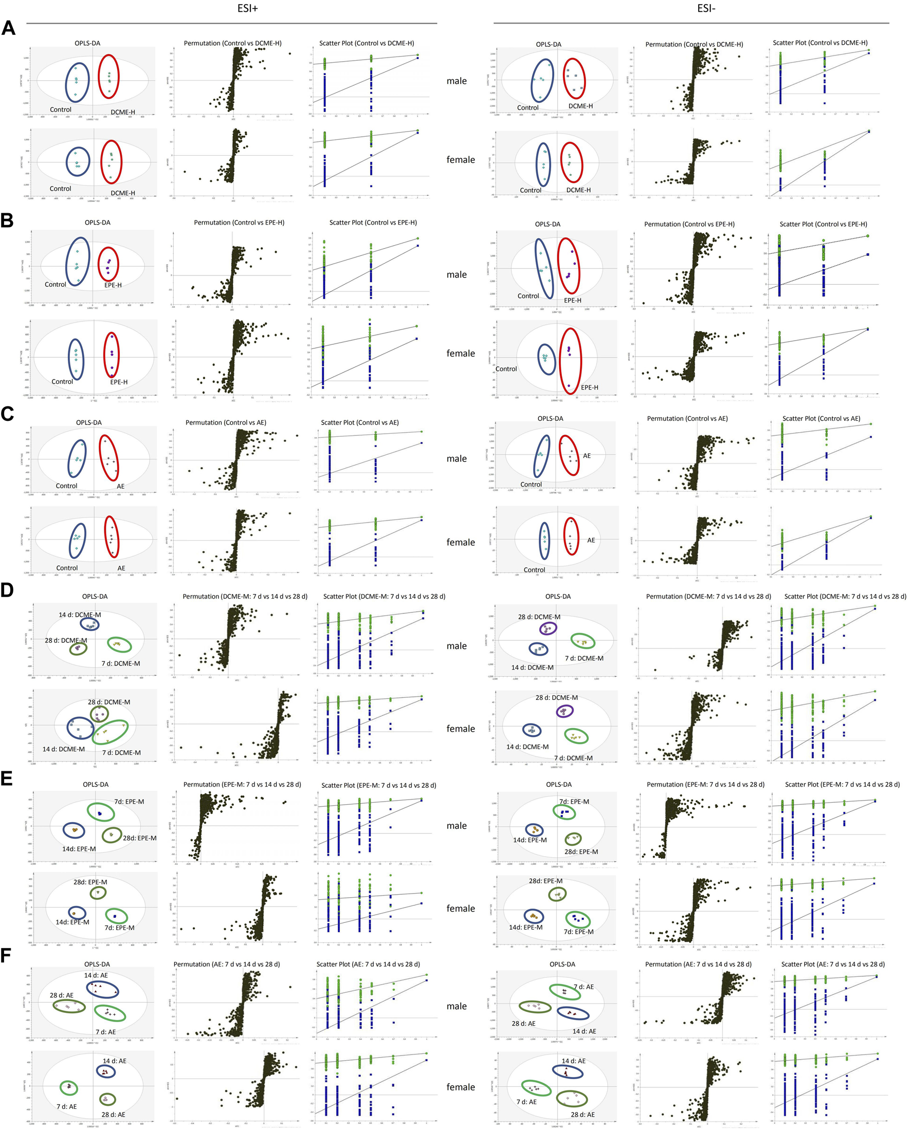 The OPLS-DA score plots, S-plots and 200-permutation test in the positive (ESI+) and negative (ESI-) modes. (A) Comparison of DCME-H and Control groups. (B) Comparison of EPE-H and Control groups. (C) Comparison of AE and Control groups. (D) Comparison of DCME-M group on days 7, 14 and 28. (E) Comparison of EPE-M group on day 7, 14 and 28. (F) Comparison of AE group on day 7, 14 and 28.