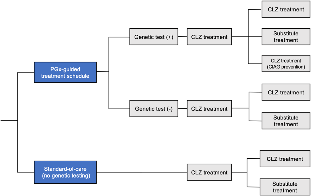 Decision tree schematic. The “Standard-of-care (no genetic testing)” compared with the “PGx-guided treatment schedule.” CIAG, clozapine-induced agranulocytosis/granulocytopenia.