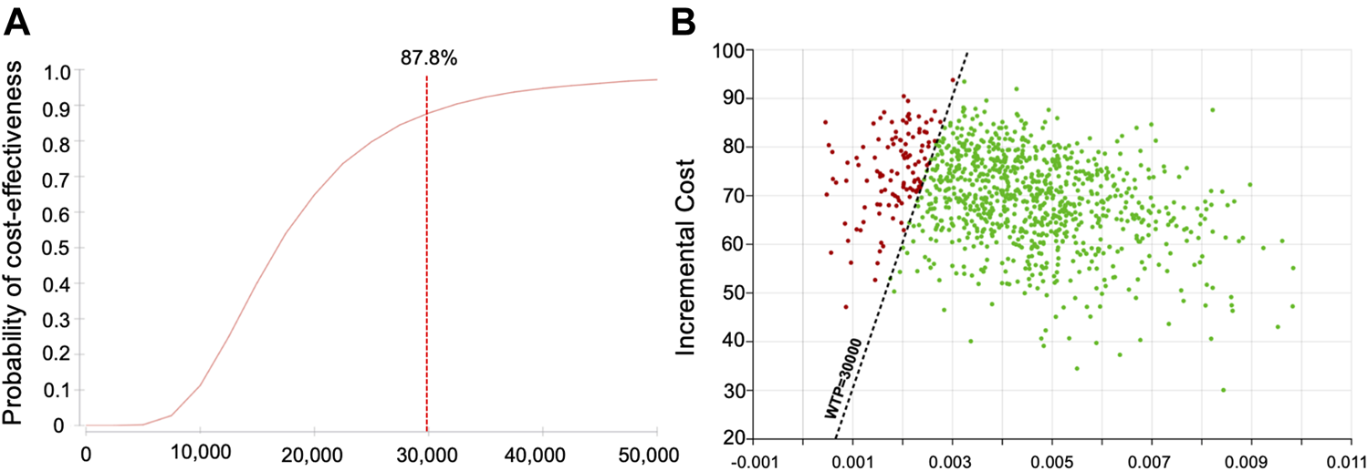 Results of probability sensitivity analysis [HLA-DQB1 (126Q), HLA-B (158T) and rs149104283] (A) Cost-effectiveness acceptability curve (B) Scatter plot for incremental cost and effectiveness: green dots indicate ICERs within willing to pay (WTP) threshold and red dots indicate out of the threshold.