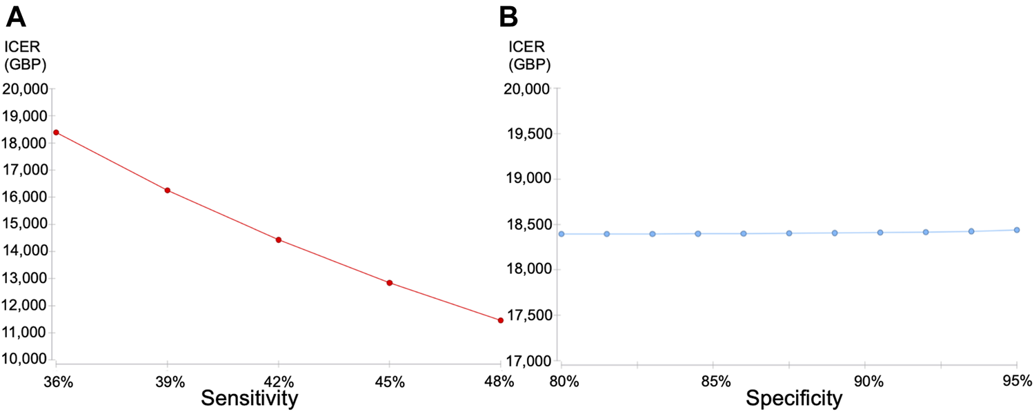Results of one-way sensitivity analysis (A) Sensitivity analysis: varying “sensitivities” (B) Sensitivity analysis: varying “specificities”, ICER incremental cost-effectiveness ratio.