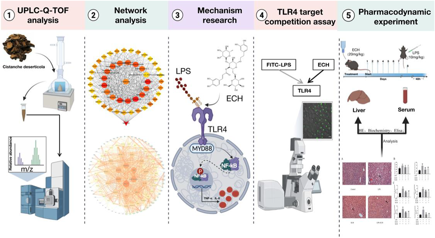 Cistanche deserticola Y.C. Ma (CD) possesses hepatoprotective activity, while the active ingredients and involved mechanisms have not been fully explored. The objective of this study was to investigate the chemical composition and hepatoprotective mechanisms of CD. We primarily used ultra-performance liquid chromatography with quadrupole time-of-flight tandem mass spectrometry (UPLC-Q-TOF-MS/MS) to identify the phenylethanoid glycoside (PhG) components of CD. Then, network analysis was used to correlate and predict the pharmacology of the identified active components of PhGs with hepatoprotection. Next, the mechanisms of the core components and targets of action were explored by cellular assays and toll-like receptor 4 (TLR4) target competition assays. Finally, its hepatoprotective effects were further validated in in vivo experiments. The results showed that a total of 34 PhGs were identified based on the UPLC-Q-TOF-MS/MS method. Echinacoside (ECH) was identified as the key ingredient, and TLR4 and nuclear factor-kappa B (NF-κB) were speculated as the core targets of the hepatoprotective effect of CD via network analysis. The cellular assays confirmed that PhGs had significant anti-inflammatory activity. In addition, the real-time quantitative polymerase chain reaction (RT-qPCR) and Western blot indicated that ECH notably reduced the levels of interleukin 6 (IL-6) and tumor necrosis factor alpha (TNF-α), as well as the mRNA expression of TLR4, TNF-α, and IL-6, and decreased the high expression of the TLR4 protein, which in turn downregulated the myeloid differentiation factor 88 (MyD88), p-P65 and TNF-α proteins in the inflammatory model. The target competition experiments suggested that ECH and LPS could competitively bind to the TLR4 receptor, thereby reducing the expression of TLR4 downstream proteins. The results of in vivo studies showed that ECH significantly ameliorated LPS-induced hepatic inflammatory infiltration and liver tissue damage and reduced serum alanine aminotransferase (ALT) and aspartate aminotransferase (AST) levels in mice. Moreover, ECH remarkably inhibited the release of inflammatory factors such as TNF-α, IL-6, IL-1β, and MCP-1 in the serum of mice, exerting the hepatoprotective effect by the TLR4/NF-κB signaling pathway. More importantly, ECH could act as a potential inhibitor of TLR4 and deserves further in-depth study. Our results could provide a basis for exploring the hepatoprotective properties of CD.