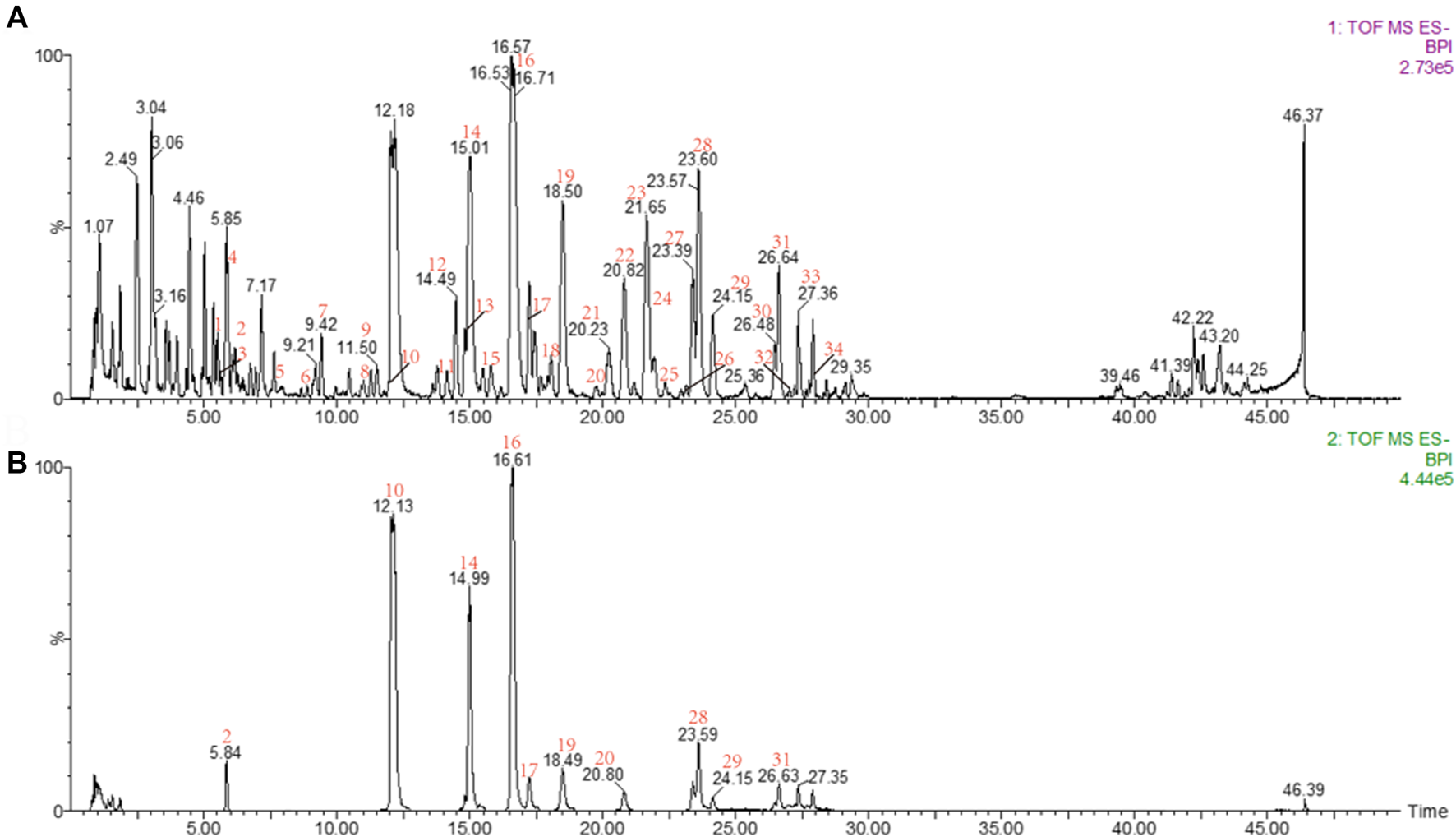 (A) BPI of the sample; (B) BPI of the reference substance: peak 2, salidroside; peak 10, echinacoside; peak 14, cistanoside A; peak 16, acteoside; peak 17, tubuloside A; peak 19, isoacteoside; peak 20, poliumoside; peak 28, 2′-acetylacteoside; peak 29, osmanthuside B; peak 31, tubuloside B.