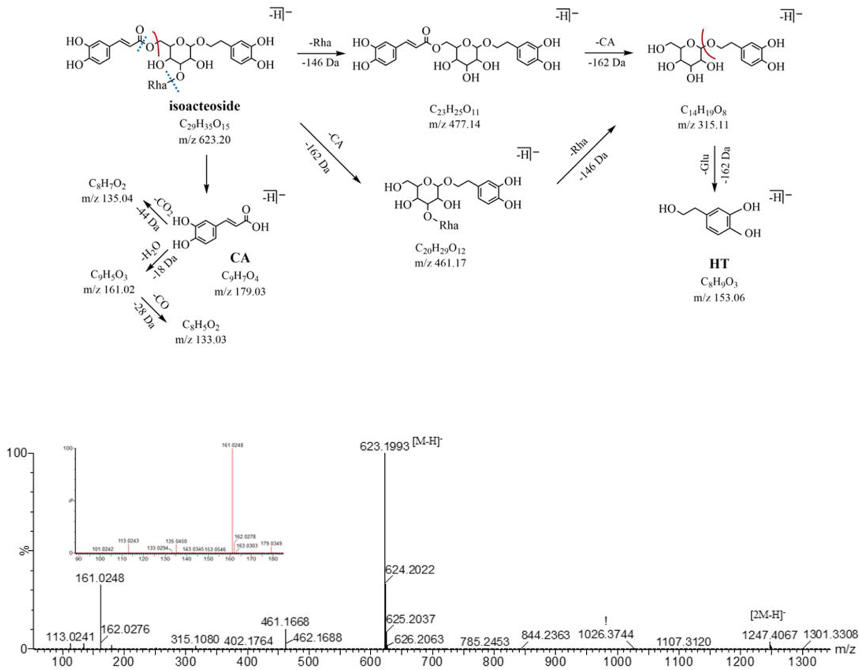 | 16 | 16.58 | 623.1987 | 1.8 | C29H35O15 | 461.1675, 315.1092, 179.0354, 161.0250 | Acteosidea |