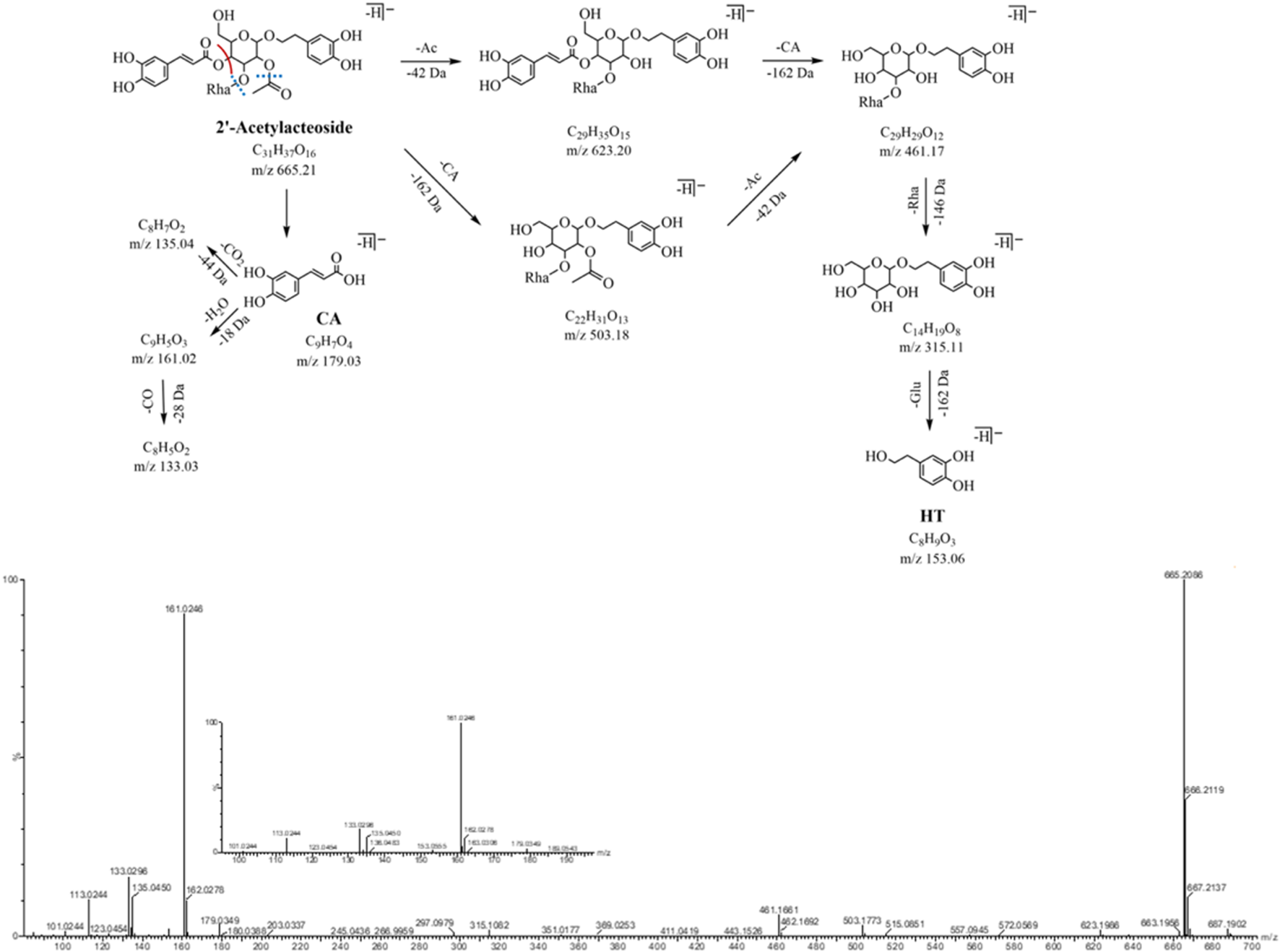 | 28 | 23.60 | 665.2087 | 0.8 | C31H37O16 | 623.1995, 503.1774, 461.1662, 179.0349 | 2’-Acetylacteosidea |