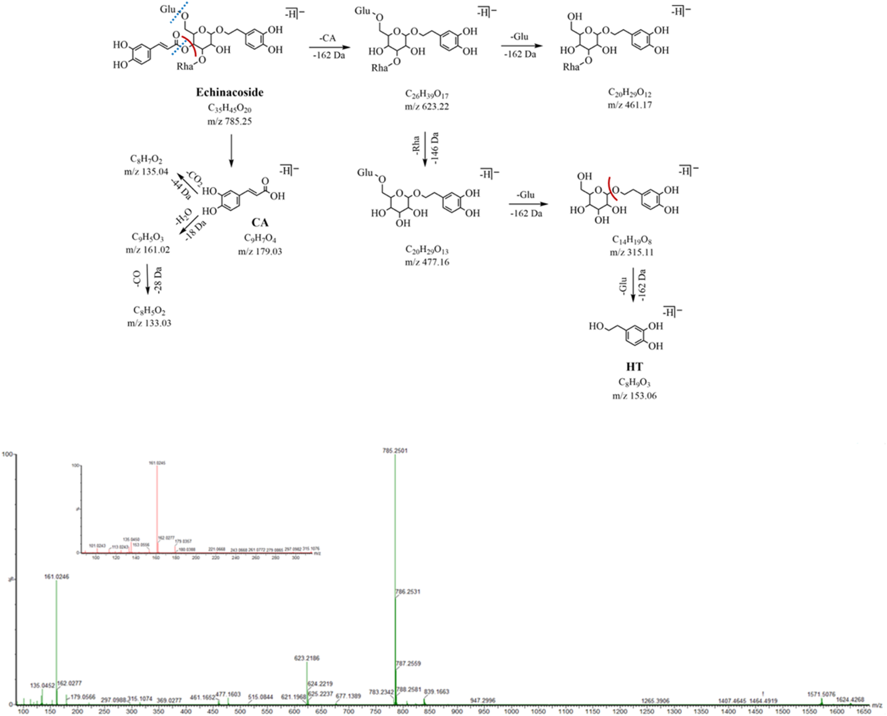 | 10 | 12.06 | 785.2492 | −1.5 | C35H45O20 | 623.2180, 477.1604, 315.1084, 161.0245 | Echinacosidea |