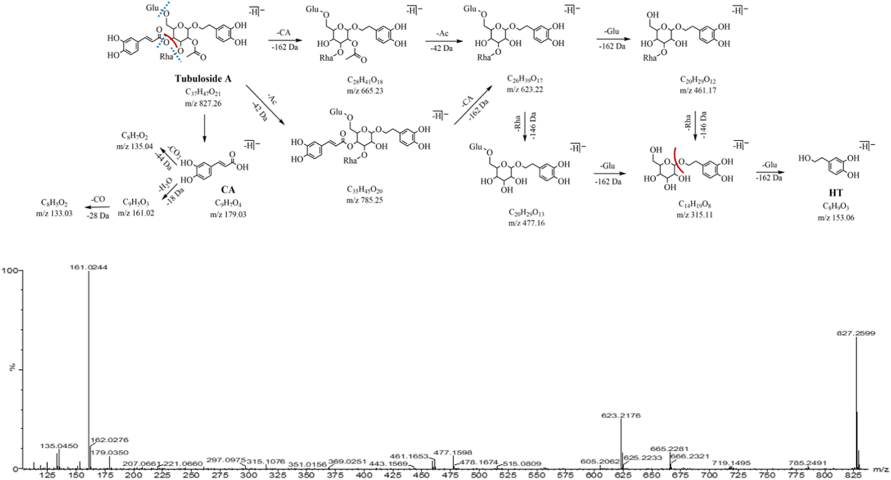 | 17 | 17.24 | 827.2615 | 0.6 | C37H47O21 | 665.2293, 623.2187, 477.1606, 161.0247 | Tubuloside Aa |