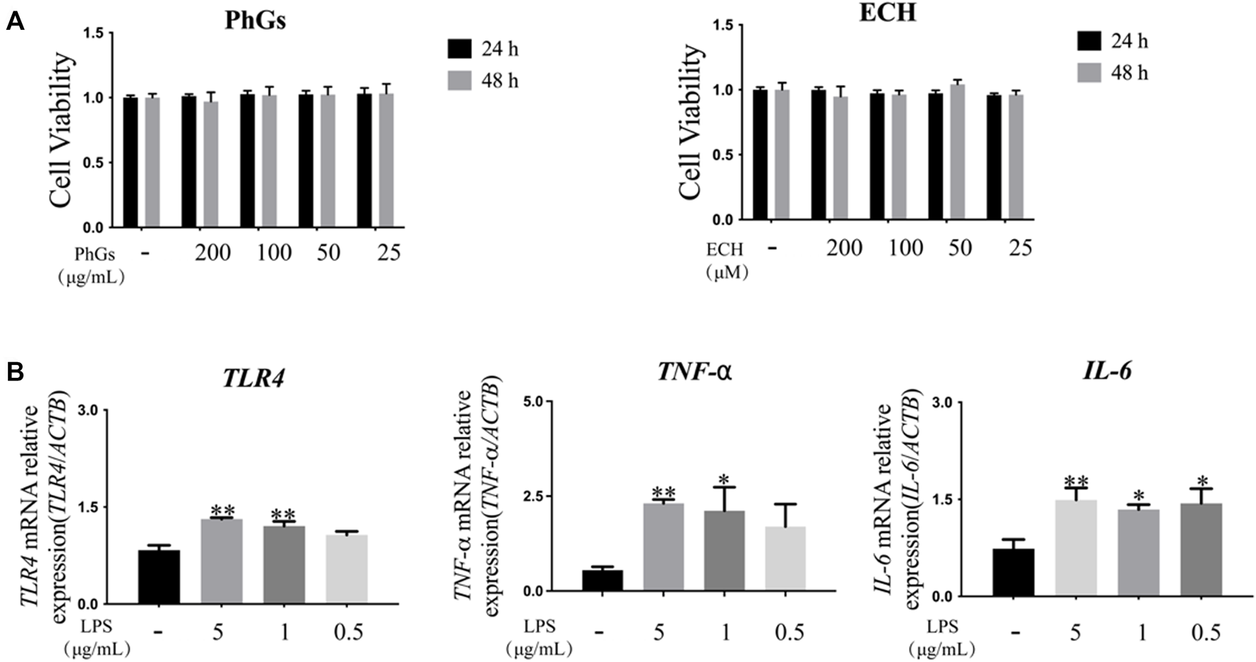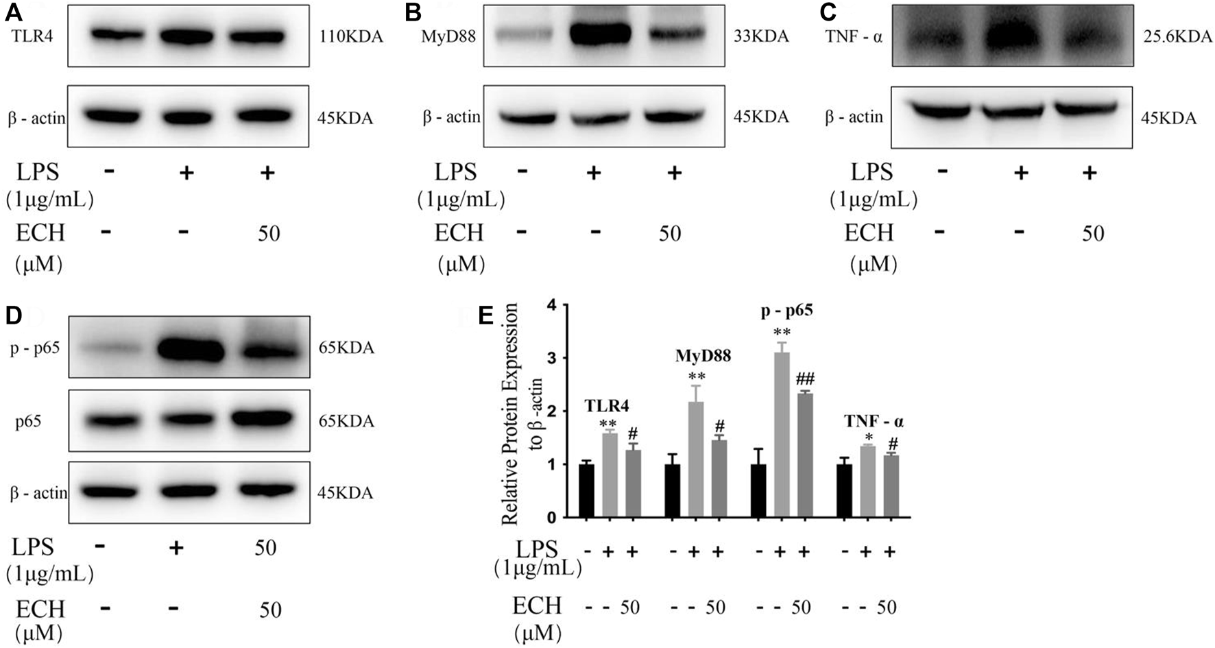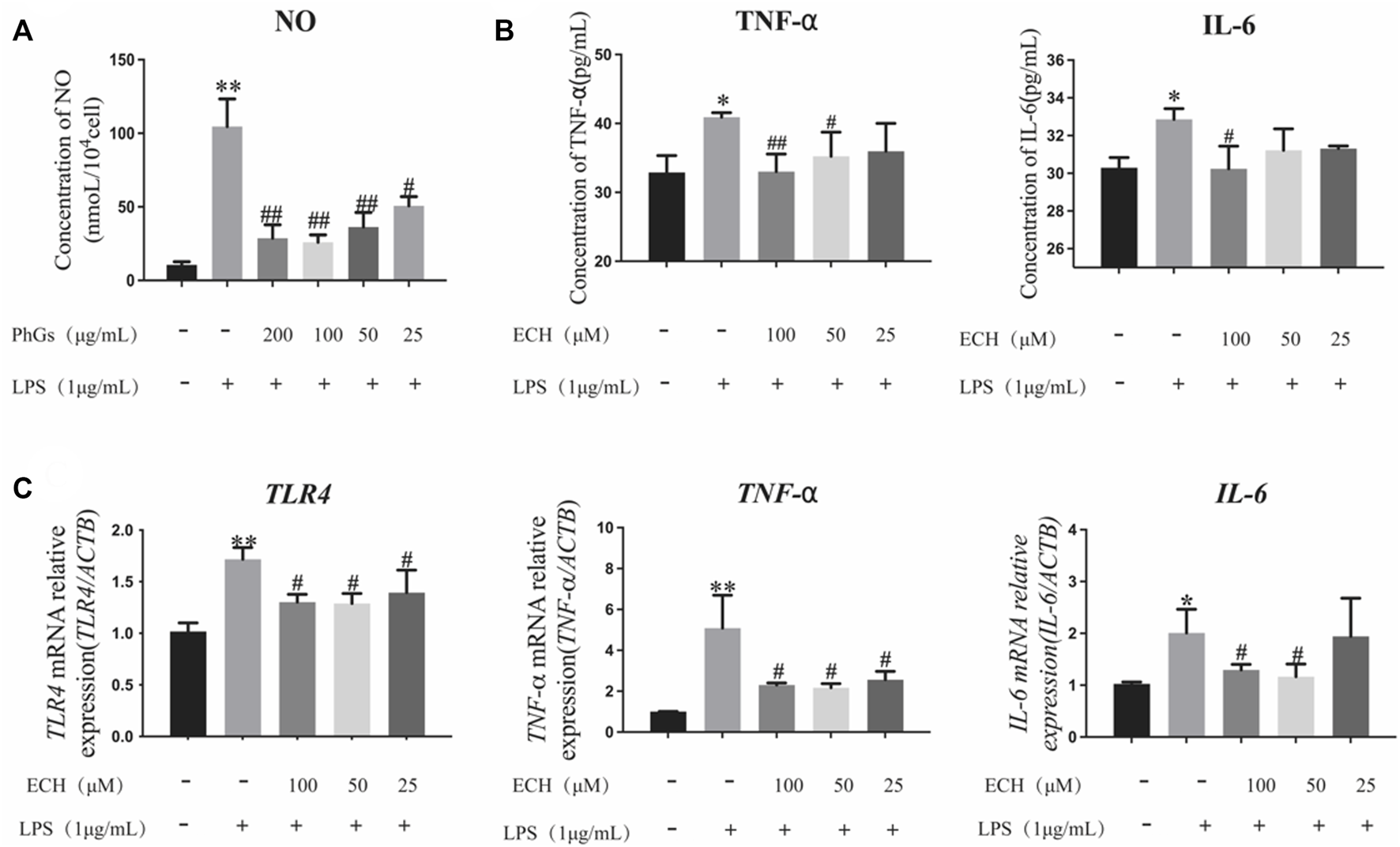 Thermo Fisher Scientific in the United States provided HPLC-grade methanol, acetonitrile, and formic acid. Watsons provided distilled water (Watsons Food and Beverage Co., Ltd., Guangzhou, China). The materials obtained are as follows: 1640 medium and fetal bovine serum (FBS) (Gibco, United States); penicillin–streptomycin liquid (Bioharp, Hefei, China); ECH (Chengdu Must Bio-technology Co., Ltd.; Chengdu, China); LPS (Meilunbio, Dalian, China); FITC-LPS (Sigma, United States); CCK-8 Kit and Simply P Total RNA Extraction Kit (Bioss, Beijing, China); MCP-1, IL-1β, IL-6, TNF-α, and NO Elisa Kits (Shanghai Enzyme-linked Biotechnology Co., Ltd., Shanghai, China); ALT and AST reagents (URIT Medical Electronic Co., Ltd., Guilin, China); StarLighter SYBR Green qPCR MIX and StarLighter Script RT all-in-one MIX (Beijing Foreverstar Biotech Co., Ltd., Beijing, China); PMSF, RIPA tissue/cell lysate (Beijing Solarbio Science and Technology Co., Ltd., Beijing, China); SDS-PAGE Sample Loading Buffer and BCA Protein Assay Kit (Beyotime Biotechnology Company, Beijing, China); PAGE Gel Fast Preparation Kit, Tris-glycine/SDS running buffer, transfer buffer, and TBST (Shanghai Epizyme Biomedical Technology Co., Ltd., Shanghai, China); primary antibody and secondary antibody dilution for Western blot (Absin, Shanghai, China). The detailed information of antibodies is shown in Supplementary Table S2.