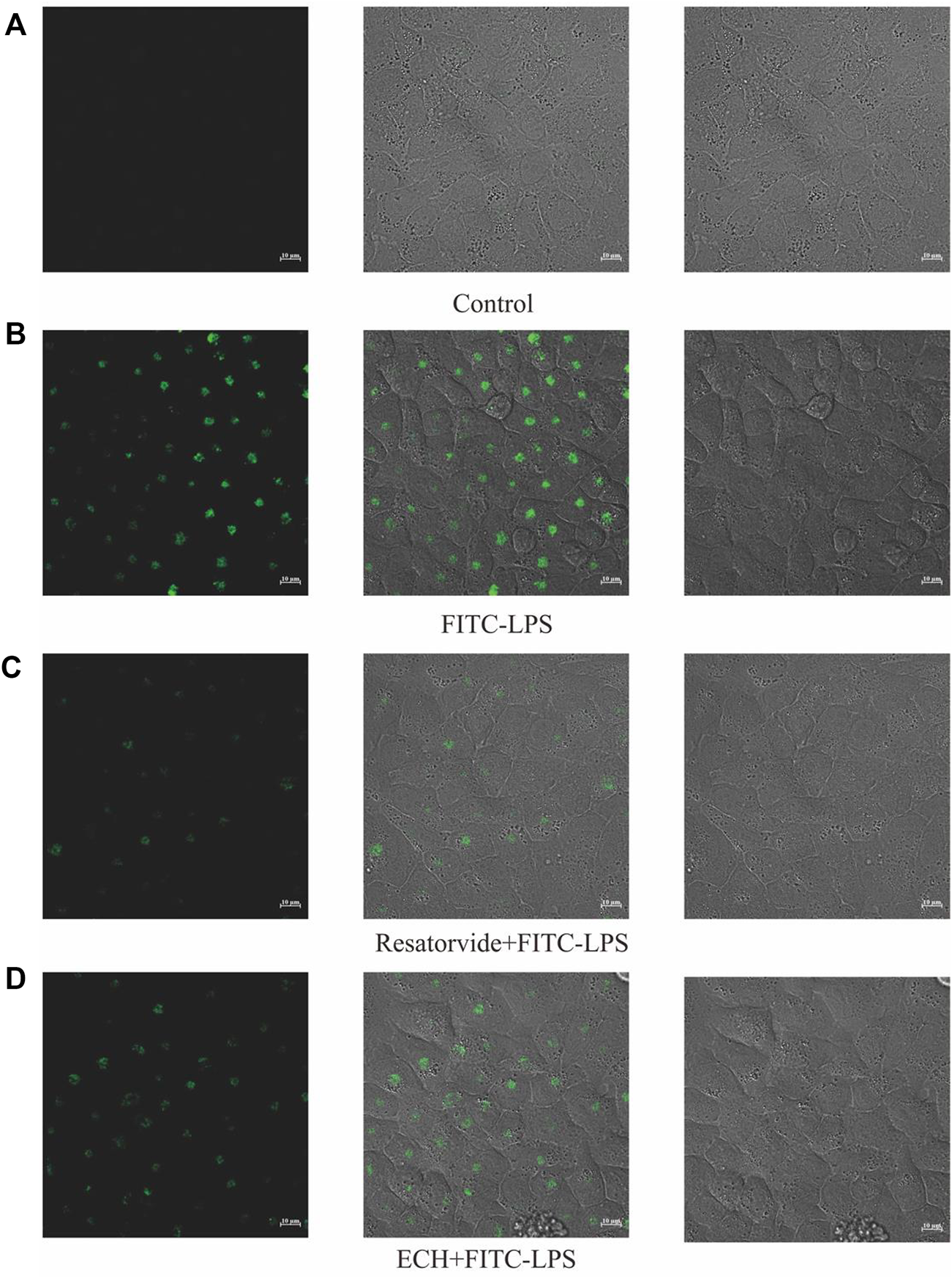 The cells were cultured in 20-mm confocal dishes and divided into four groups: the control group, the FITC-LPS group, the resatorvid+FITC-LPS group, and the ECH+FITC-LPS group. Only a complete medium was added to the control group. Only a complete medium containing 10 μg/ml of FITC-LPS was added to the FITC-LPS group. The resatorvid+FITC-LPS group was used as the positive control by adding the complete medium containing 150 μM TLR4 inhibitor and 10 μg/ml of FITC-LPS. To the ECH+FITC-LPS group was added the complete medium containing 200 μM of ECH solution and 10 μg/ml of FITC-LPS. After incubating the aforementioned four groups simultaneously for 90 min, the cell cultures were aspirated, discarded, rinsed 3–5 times using PBS, and then the phenol red free medium was added. Each group of experiments was repeated three times. Fluorescence detection was performed using a confocal fluorescence microscope (ZEISS LSM880+Fast Airyscan). The laser pinhole was opened at 100 nm, and the FITC green fluorescence channel was used with an excitation wavelength of 488 nm.