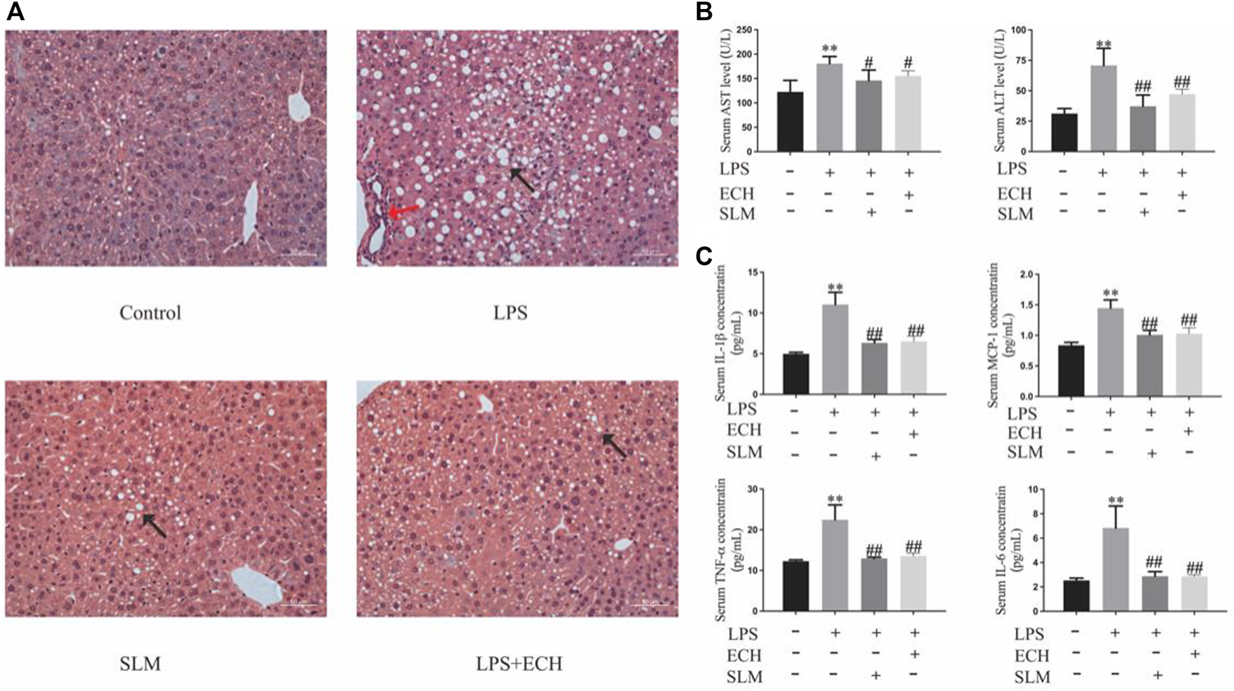 Male C57BL/6 mice (8-week-old; weight 16–20 g) were obtained from Weitonglihua Laboratory Animal Technology Co., Ltd. (Beijing, China). The animal experiments were carried out under the supervision of the Animal Experiment Center of Shandong University of Traditional Chinese Medicine, and the study protocol was approved by the Laboratory Animal Care and Use Committee of Shandong University of Traditional Chinese Medicine. The mice were housed in an (specified pathogen-free) SPF animal laboratory with standard temperature and humidity and subjected to a 12-h light–dark cycle. All animals had free access to food and water. To compare the efficacy of silymarin (SLM) as a positive drug with that of traditional ECH, all the mice were randomly divided into four groups (n = 12): the control group, the LPS group, the SLM+LPS group, and the ECH+LPS group. The LPS group, the SLM+LPS group, and the ECH+LPS group were given LPS at the same frequency at a dose of 10 mg/kg (i.p.), and the control group was given equal amounts of normal saline. To investigate the effect of ECH on LPS-induced liver injury, the mice in SLM and ECH groups were separately treated with SLM (36.4 mg/kg, i. g.) and ECH (20 mg/kg, i. g.) once on a daily basis for 7 days before LPS administration (Jia et al., 2014; Zhang et al., 2021). The control group and the LPS group were only given normal saline. After being given LPS 48 h later, the mice were anesthetized and dissected. Blood samples were collected, centrifuged at 3000 rpm for 15 min, and serum was separated for further analysis. Liver tissues were collected and quickly fixed in 4% paraformaldehyde or frozen in liquid nitrogen for further analysis.