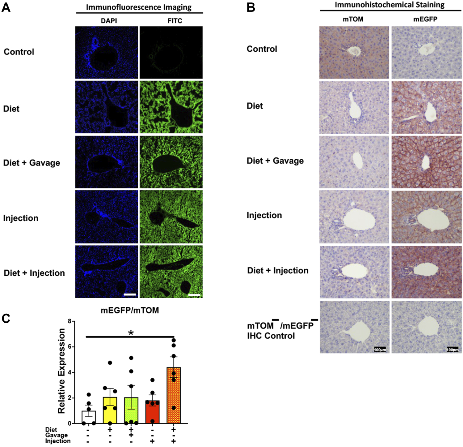 FIGURE 3. Inducible Cre-mediated expression of membrane-localized enhanced GFP (mEGFP) in the liver. (A) Representative fluorescence photomicrographs of fixed liver sections of R26Cre−ERT2/mTOM-mEGFP mice subjected to different TAM-dosing regimens: TAM-diet (N = 6), TAM-diet plus TAM-oral gavage (N = 6), TAM-injections (N = 8), and TAM-diet plus TAM-injections (N = 8) showing complete mEGFP labeling in the hepatocytes. Green fluorescence was not evident in the liver of control mice fed a regular chow diet (N = 4). Scale bars: 170 µm. (B) Representative immunohistochemical photomicrographs of liver sections of R26Cre−ERT2/mTOM-mEGFP mice subjected to different TAM-dosing regimens: TAM-diet (N = 5), TAM-diet plus TAM-oral gavage (N = 5), TAM-injections (N = 5), and TAM-diet plus TAM-injections (N = 5) showing complete mEGFP labeling in the hepatocytes. Widespread mTOM labeling was detected in the liver of regular chow diet-fed control mice (N = 5). The mTOM−/mEGFP− mice (N = 4) lacking reporter transgene were included as IHC controls to ascertain the absence of mTOM or mEGFP staining. (C) Quantitative real-time RT-PCR showing the relative expression of mEGFP/mTOM in liver homogenate from the four TAM treatments and control groups. Statistical analysis was performed by one-ANOVA followed by Tukey’s multiple-comparison post hoc test. Data are represented as mean ± SEM. *p < 0.05. N = 5–6.