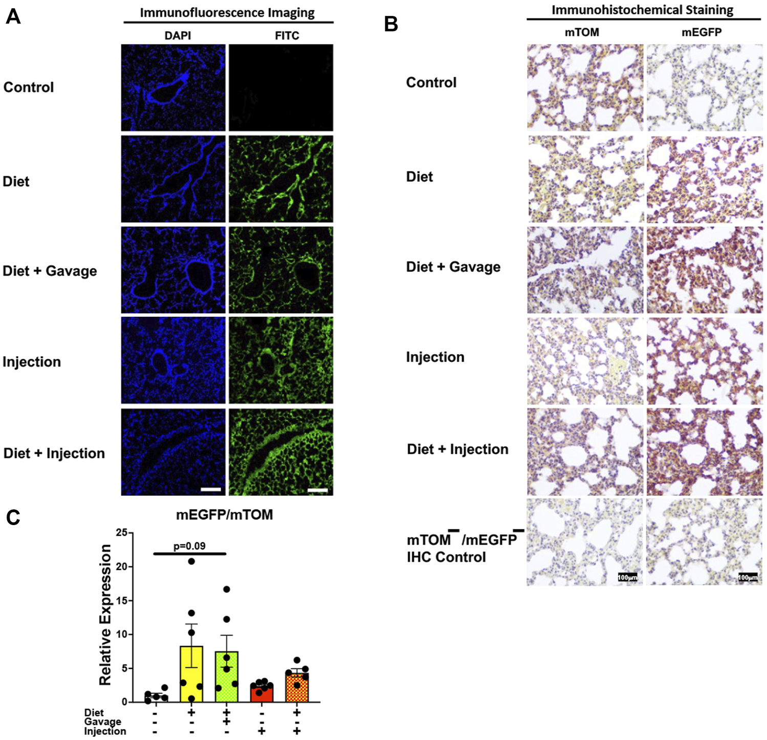 Next, we analyzed Cre-ERT2-mediated recombination in the lungs of mice on different TAM regimens. TAM administration resulted in mEGFP expression in the airway and alveolar epithelial cells of all mice observed: combined TAM-diet plus TAM-injections (7/7), combined TAM-diet plus TAM-oral gavage (4/4), TAM-diet only (4/6), and TAM-injections only (6/8) (Figure 4A). The recombination appeared to be complete, as evident by robust expression of mEGFP, in all of the TAM regimens tested (Figure 4A). The control animals did not show any mEGFP expression in all the cells of the lungs. The immunohistochemical staining confirmed that the mEGFP expression is absent in the control mice and that the mEGFP expression is evident in all four TAM-treatment groups. However, the signal for mTOM persisted in all four TAM-treatment groups (Figure 4B) suggesting a slow turnover of mTOM protein that was translated before the recombination event took place. While the relative expression levels of mEGFP to mTOM transcripts were found to be higher in all TAM-treatment groups, the differences were not statistically significant as compared to the control group (Figure 4C).