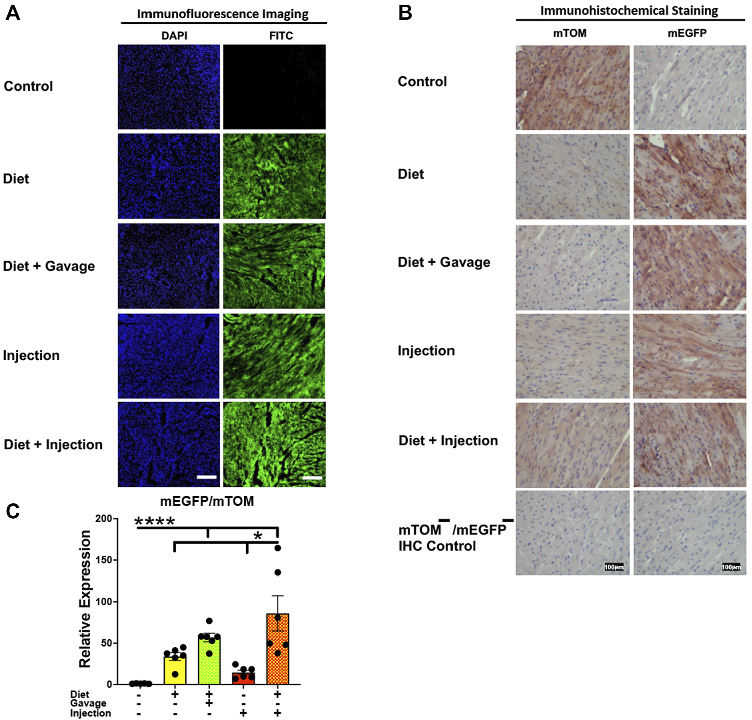 FIGURE 5. Inducible Cre-mediated expression of membrane-localized enhanced GFP (mEGFP) in the heart. (A) Representative photomicrographs of fixed heart sections of R26Cre−ERT2/mTOM-mEGFP mice subjected to different TAM-dosing regimens: TAM-injections (N = 8), TAM-diet (N = 6), TAM-diet plus TAM-injections (N = 8), and TAM-diet plus TAM-oral gavage (N = 6) showing near-complete mEGFP labeling. Green fluorescence was not evident in the heart of control mice fed a regular chow diet (N = 4). Scale bars: 170 µm. (B) Representative immunohistochemical photomicrographs of heart sections of R26Cre−ERT2/mTOM-mEGFP mice subjected to different TAM-dosing regimens: TAM-diet (N = 5), TAM-diet plus TAM-oral gavage (N = 5), TAM-injections (N = 5), and TAM-diet plus TAM-injections (N = 5) showing complete mEGFP labeling in the cardiac myofibers. Widespread mTOM labeling was detected in the heart of regular chow diet-fed control mice (N = 5). The mTOM−/mEGFP− mice (N = 4) lacking reporter transgene were included as IHC controls to ascertain the absence of mTOM or mEGFP staining. (C) Quantitative real-time RT-PCR showing the relative expression of mEGFP/mTOM in heart homogenate from the four TAM treatments and control groups. Statistical analysis was performed by one-ANOVA followed by Tukey’s multiple-comparison post hoc test. Data are represented as mean ± SEM. *p < 0.05, ****p < 0.0001. N = 5–6.
