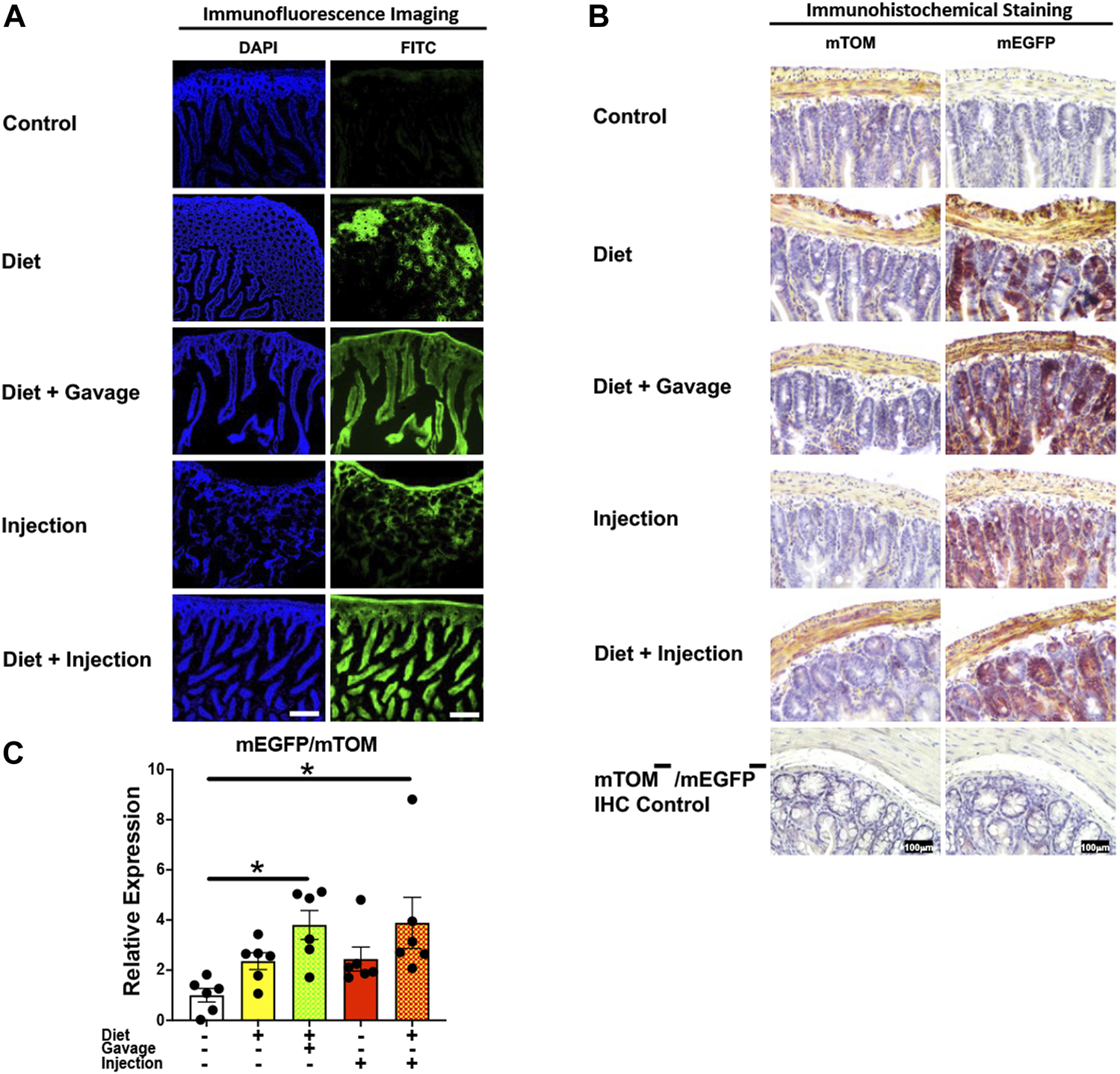 FIGURE 6. Inducible Cre-mediated expression of membrane-localized enhanced GFP (mEGFP) in the small intestine. (A) Representative photomicrographs of fixed small intestine sections of R26Cre−ERT2/mTOM-mEGFP mice subjected to different TAM-dosing regimens: TAM-injections (N = 7), TAM-diet (N = 6), TAM-diet plus TAM-injections (N = 8), and TAM-diet plus TAM-oral gavage (N = 4) showing partial to complete mEGFP labeling. Green fluorescence was not evident in the small intestine of control mice fed a regular chow diet (N = 3). Scale bars: 170 µm. (B) Representative immunohistochemical photomicrographs of small intestine sections of R26Cre−ERT2/mTOM-mEGFP mice subjected to different TAM-dosing regimens: TAM-diet (N = 5), TAM-diet plus TAM-oral gavage (N = 5), TAM-injections (N = 5), and TAM-diet plus TAM-injections (N = 5) showing partial to complete mEGFP labeling. mTOM labeling was detected in the small intestine of regular chow diet-fed control mice (N = 5). The mTOM−/mEGFP− mice (N = 4) lacking reporter transgene were included as IHC controls to ascertain the absence of mTOM or mEGFP staining. (C) Quantitative real-time RT-PCR showing the relative expression of mEGFP/mTOM in small intestine homogenate from the four TAM treatments and control groups. Statistical analysis was performed by one-ANOVA followed by Tukey’s multiple-comparison post hoc test. Data are represented as mean ± SEM. *p < 0.05. N = 5–6.
