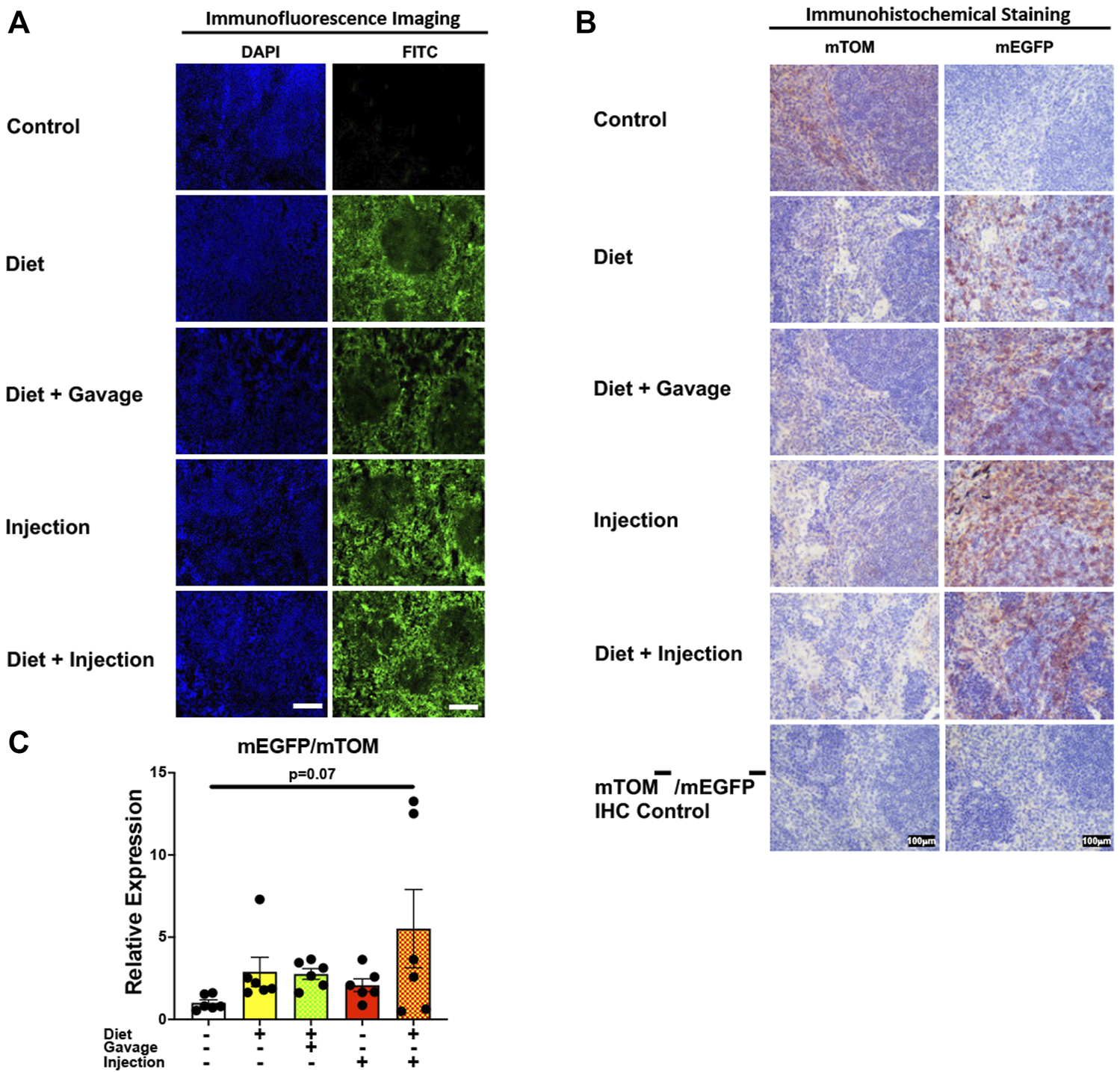 FIGURE 7. Inducible Cre-mediated expression of membrane-localized enhanced GFP (mEGFP) in the spleen. (A) Representative photomicrographs of fixed spleen sections of R26Cre−ERT2/mTOM-mEGFP mice subjected to different TAM-dosing regimens: TAM-injections (N = 6), TAM-diet (N = 6), TAM-diet plus TAM-injections (N = 8), and TAM-diet plus TAM-oral gavage (N = 4) showing complete mEGFP labeling. Green fluorescence was not evident in the spleen of control mice fed a regular chow diet (N = 4). Scale bars: 170 µm. (B) Representative immunohistochemical photomicrographs of spleen sections of R26Cre−ERT2/mTOM-mEGFP mice subjected to different TAM-dosing regimens: TAM-diet (N = 5), TAM-diet plus TAM-oral gavage (N = 5), TAM-injections (N = 5), and TAM-diet plus TAM-injections (N = 5) showing complete mEGFP labeling. Widespread mTOM labeling was detected in the spleen of regular chow diet-fed control mice (N = 5). The mTOM−/mEGFP− mice (N = 4) lacking reporter transgene were included as IHC controls to ascertain the absence of mTOM or mEGFP staining. (C) Quantitative real-time RT-PCR showing the relative expression of mEGFP/mTOM in spleen homogenate from the four TAM treatments and control groups. Statistical analysis was performed by one-ANOVA followed by Tukey’s multiple-comparison post hoc test. N = 5–6.