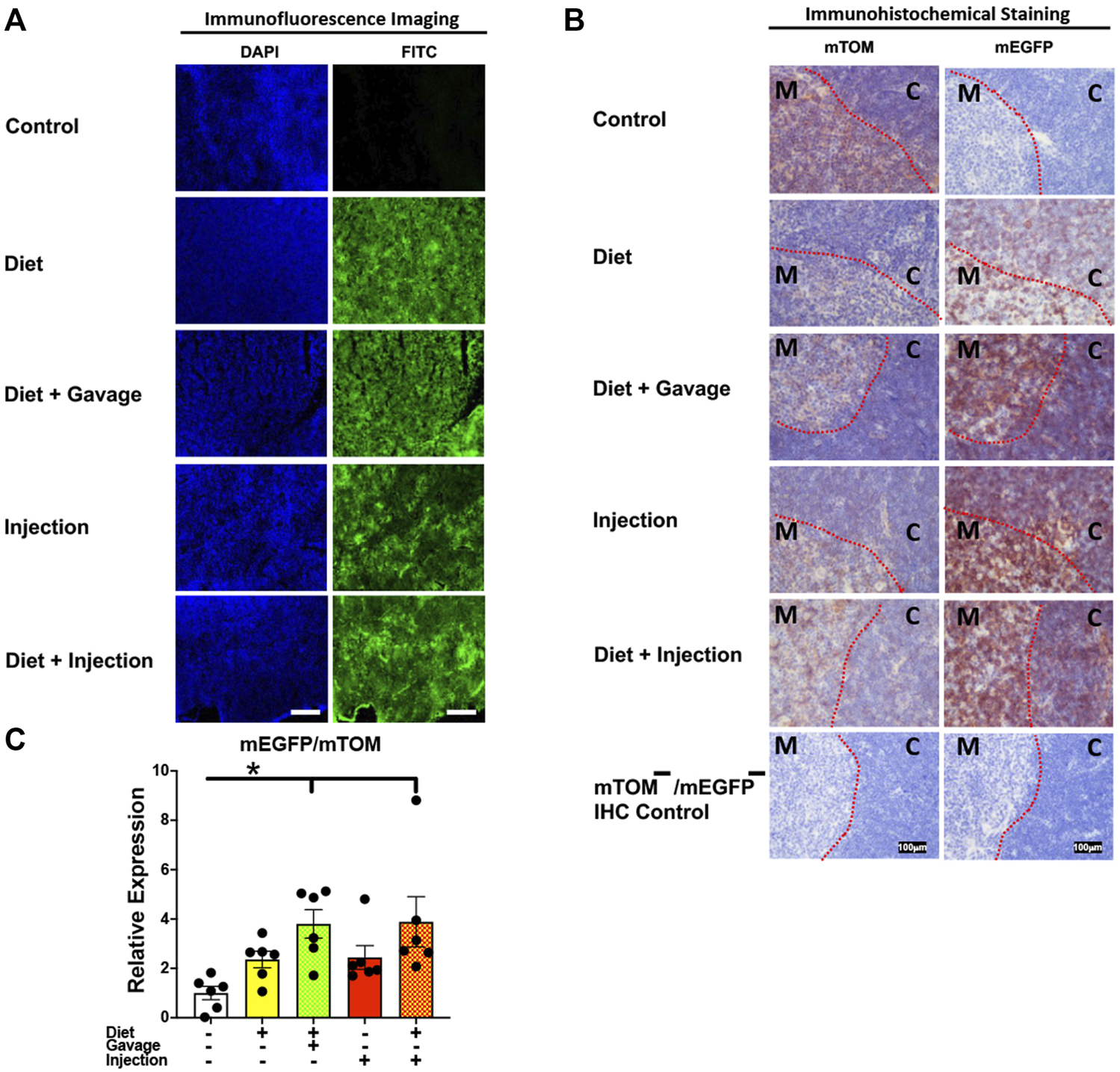 FIGURE 8. Inducible Cre-mediated expression of membrane-localized enhanced GFP (mEGFP) in the thymus. (A) Representative photomicrographs of fixed thymus sections of R26Cre−ERT2/mTOM-mEGFP mice subjected to different TAM-dosing regimens: TAM-injections (N = 6), TAM-diet (N = 6), TAM-diet plus TAM-injections (N = 8), and TAM-diet plus TAM-oral gavage (N = 4) showing complete mEGFP labeling. Green fluorescence was not evident in the thymus of control mice fed a regular chow diet (N = 4). Scale bars: 170 µm. (B) Representative immunohistochemical photomicrographs of thymus sections of R26Cre−ERT2/mTOM-mEGFP mice subjected to different TAM-dosing regimens: TAM-diet (N = 5), TAM-diet plus TAM-oral gavage (N = 5), TAM-injections (N = 5), and TAM-diet plus TAM-injections (N = 5) showing complete mEGFP labeling in the medulla (M) and cortex (C). Widespread mTOM labeling was detected in the thymus of regular chow diet-fed control mice (N = 5). The mTOM−/mEGFP− mice (N = 4) lacking reporter transgene were included as IHC controls to ascertain the absence of mTOM or mEGFP staining. The dotted red lines indicate boundary between medulla and cortex. (C) Quantitative real-time RT-PCR showing the relative expression of mEGFP/mTOM in thymus homogenate from the four TAM treatments and control groups. Statistical analysis was performed by one-ANOVA followed by Tukey’s multiple-comparison post hoc test. Data are represented as mean ± SEM. *p < 0.05. N = 5–6.